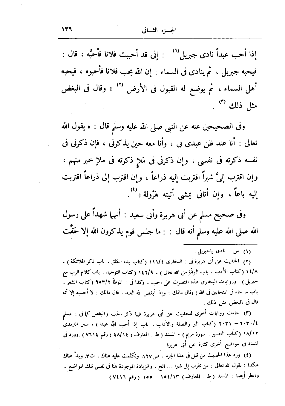 وفي الصحيحين عنه عن النبي صلى الله عيه وسلم قال: «يقول الله تعالى: أنا عند ظن عبدي بي، وأنا معه حين يذكرني، فإن ذكرني في نفسه ذكرته في نفسي، وإن ذكرني في ملأ ذكرته في ملأ خير منهم، وإن اقترب إلي شبراً اقتربت له ذراعاً، وإن اقترب إلي ذراعاً اقتربت إليه باعاً، وإن أتاني يمشي أتيته هرولة» .
