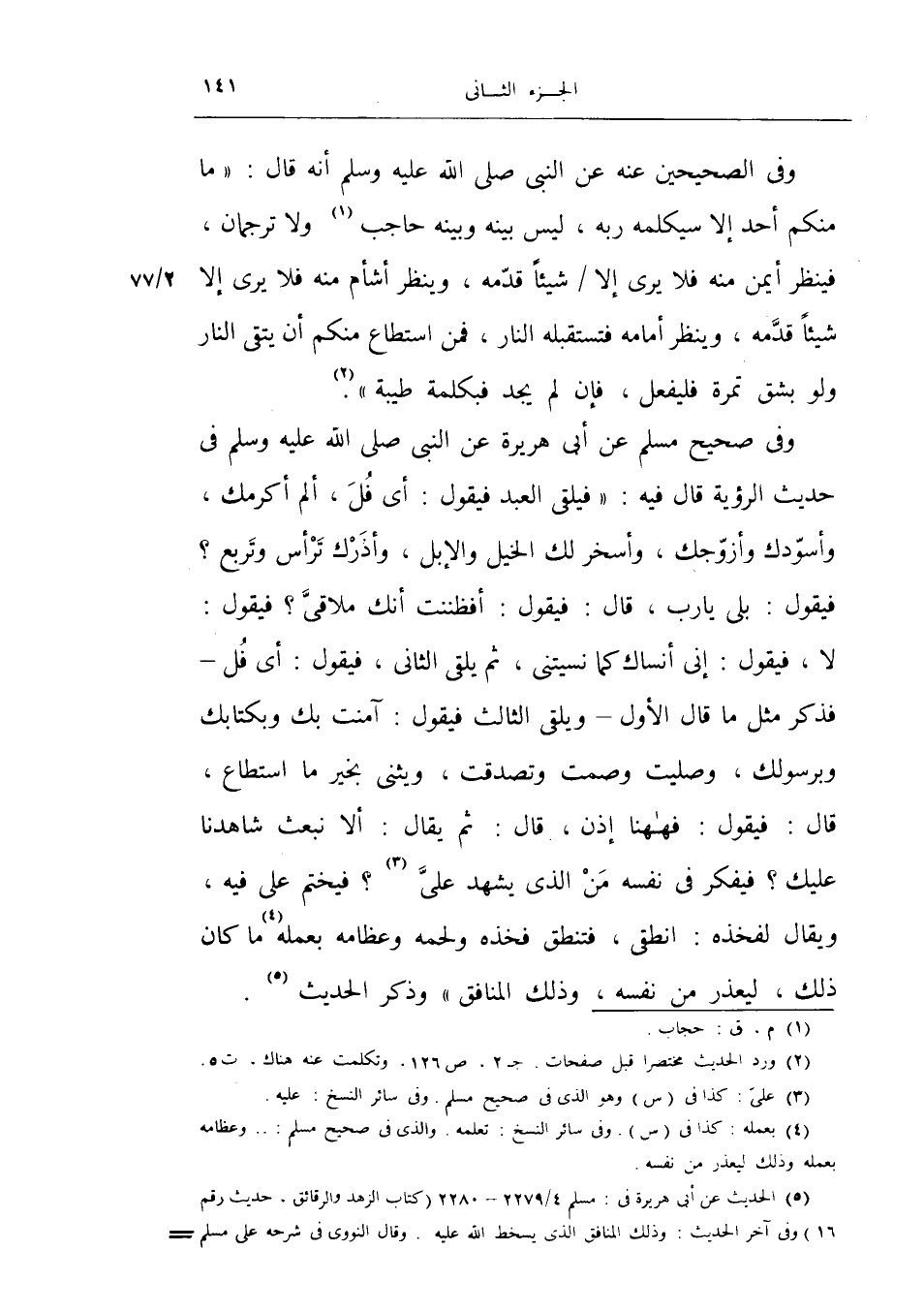 وفي الصحيحين عنه عن النبي صلى الله عليه وسلم أنه قال: «ما منكم أحد إلا سيكلمه ربه، ليس بينه وبينه حاجب ولا ترجمان، فينظر أيمن منه فلا يرى إلا شيئاً قدمه، وينظر أشأم منه فلا يرى إلا شيئاً قدمه، وينظر أمامه فتستقبله النار، فمن استطاع منكم أن يتقي النار ولو بشق تمرة فليفعل، فإن لم يجد فبكلمة طيبة» .