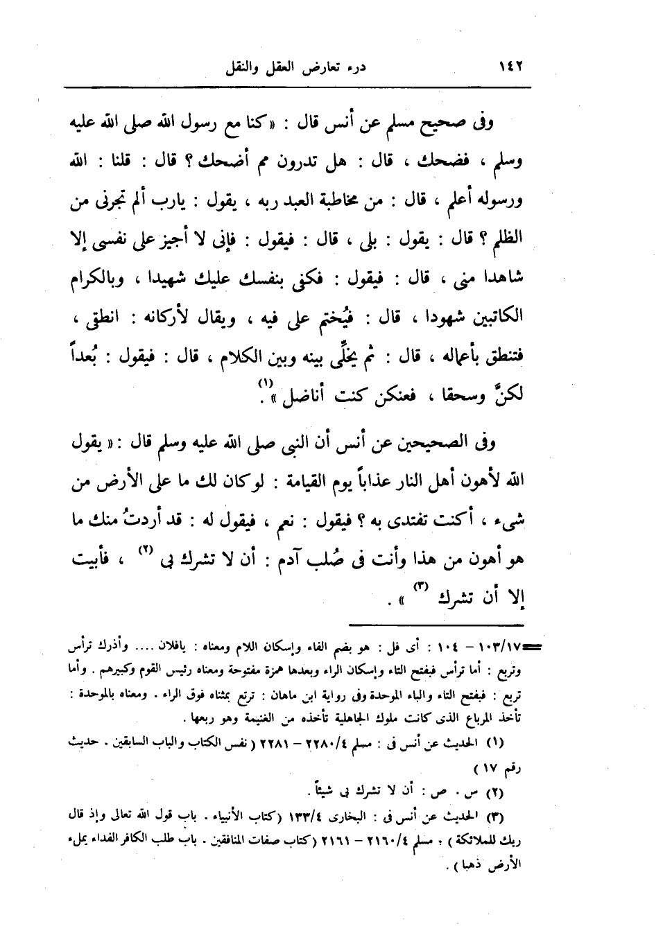 وفي الصحيحين عن أنس أن النبي صلى الله عليه وسلم قال: «يقول الله لأهون أهل النار عذاباً يوم القيامة: لو كان لك ما على الأرض من شيء، أكنت تفتدي به؟ فيقول: نعم، فيقول له: قد أردت منك ما هو أهون من هذا وأنت في صلب آدم: أن لا تشرك بي، فأبيت إلا أن تشرك» .