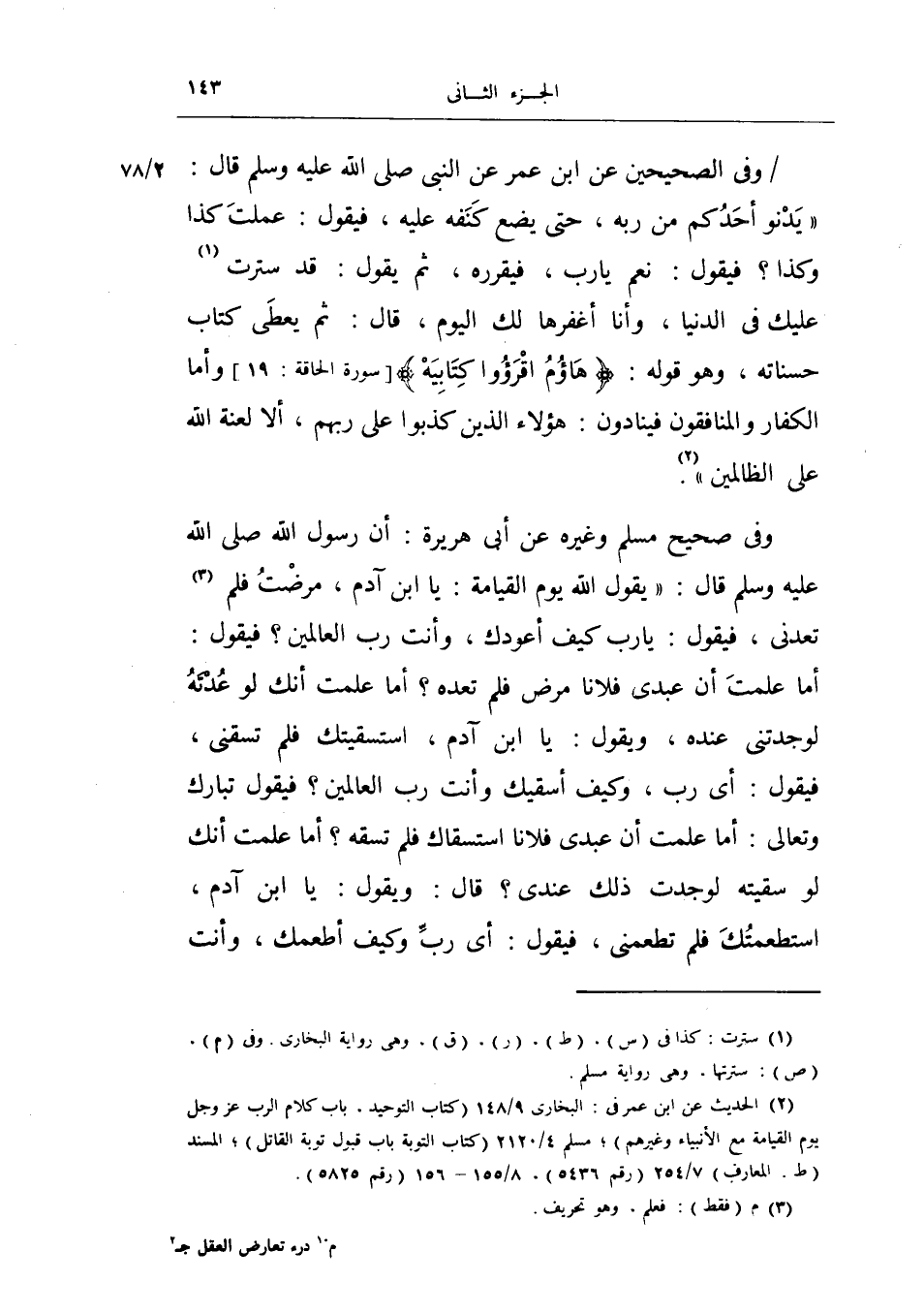 وفي صحيح مسلم وغيره عن أبي هريرة: أن رسول الله صلى الله عليه وسلم قال: «يقول الله يوم القيامة: يا ابن آدم، مرضت فلم تعدني، فيقول: يا رب كيف أعدك، وأنت رب العالمين؟ فيقول: أما علمت أن عبدي فلاناً مرض فلم تعده؟ أما علمت أنك لو عدته لوجدتني عنده، ويقول: يا ابن آدم، استسقيتك فلم تسقني، فيقول: أي رب، وكيف أسقيك وأنت رب العالمين؟ فيقول تبارك وتعالى: أما علمت أن عبدي فلاناً استسقاك فلم تسقه؟ أما علمت أنك لو سقيته لوجدت ذلك عندي؟ قال: ويقول: يا ابن آدم، استطعمتك فلم تطعمني، فيقول: أي رب وكيف أطعمك، وأنت