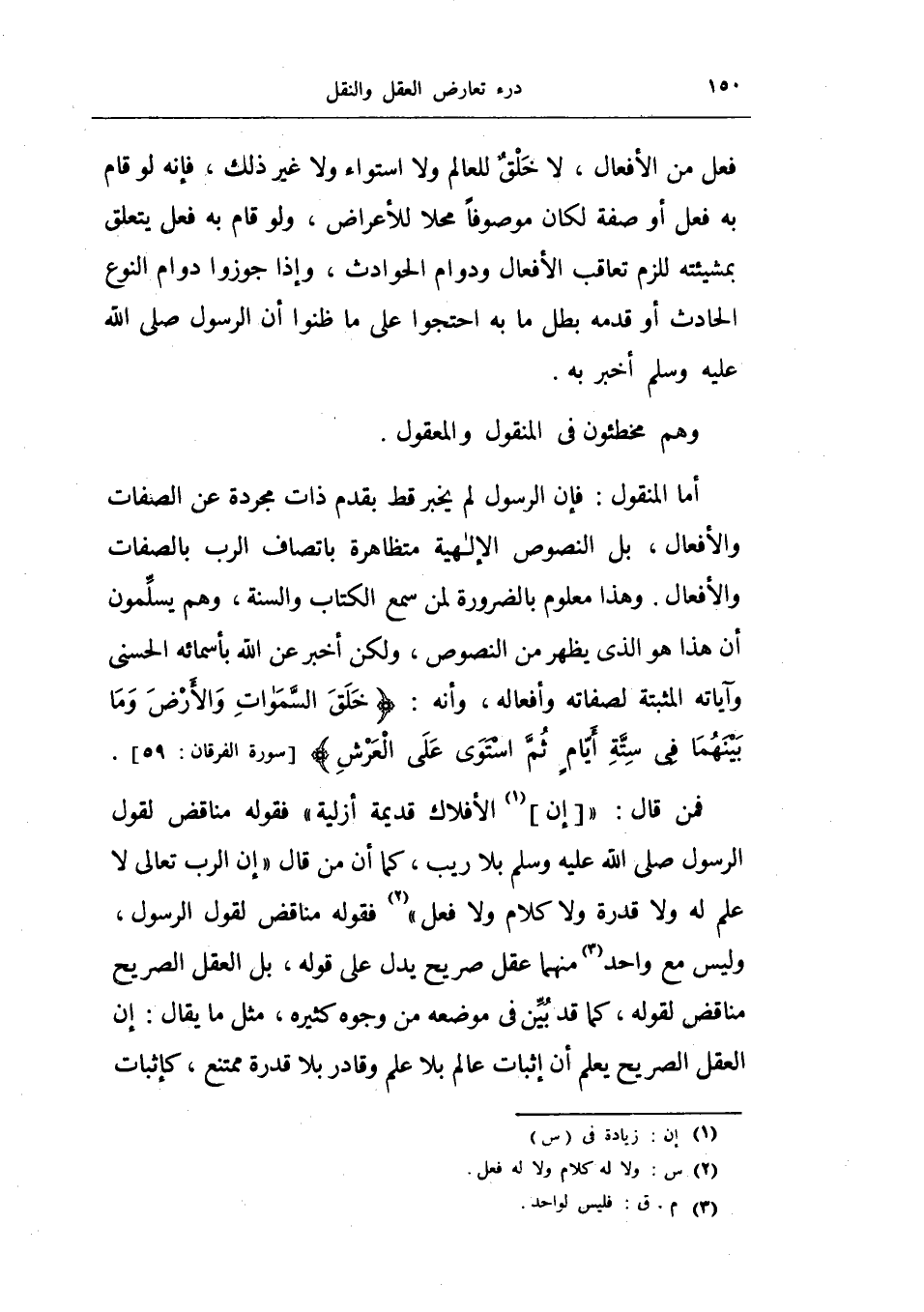 فمن قال: إن الأفلاك قديمة أزلية فقوله مناقض لقول الرسول صلى الله عليه وسلم بلا ريب، كما أن من قال (إن الرب تعالى لا علم له ولا قدرة ولا كلام ولا فعل) فقوله مناقض لقول الرسول، وليس مع واحد منهما عقل صريح يدل على قوله، بل العقل الصريح مناقض لقوله، كما قد بين في موضعه من وجوه كثيرة، مثل ما يقال: إن العقل الصريح يعلم أن إثبات عالم بلا علم وقادر بلا قدرة ممتنع، كإثبات