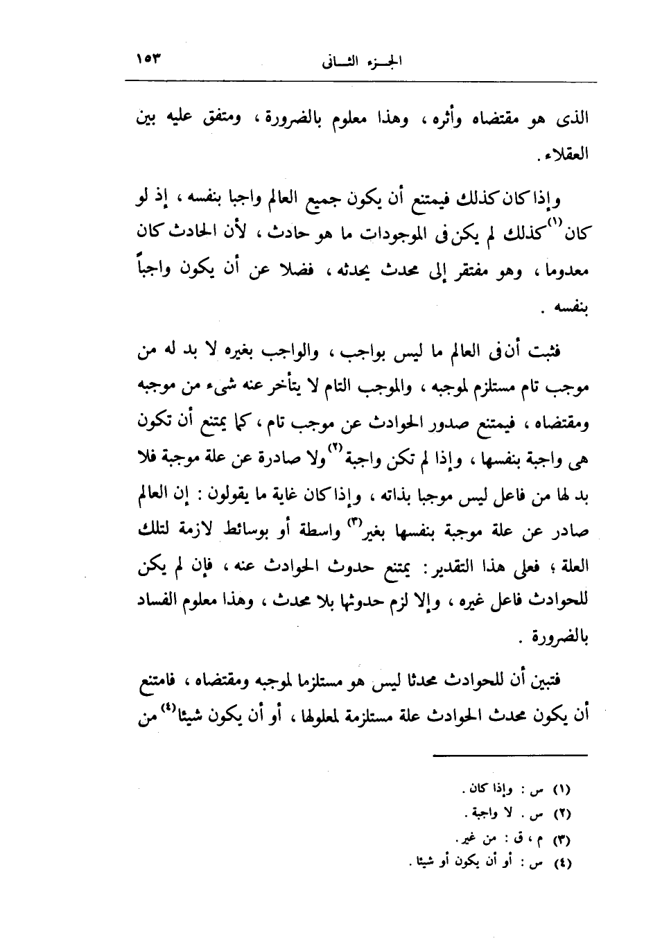 فثبت أن في العالم ما ليس بواجب، والواجب بغيره لا بد له من موجب تام مستلزم لموجبه، والموجب التام لا يتأخر عنه شيء من موجبه ومقتضاه، فيمتنع صدور الحوادث عن موجب تام، كما يمتنع أن تكون هي واجبة بنفسها، وإذا لم تكن واجبة ولا صادرة عن علة موجبة فلا بد لها من فاعل ليس موجباً بذاته، وإذا كان غاية ما يقولون: إن العالم صادر عن علة موجبة بنفسها بغير واسطة أو بوسائط لازمة لتلك العلة، فعلى هذا التقدير: يمتنع حدوث الحوادث عنه، فإن لم يكن للحوادث فاعل غيره، وإلا لزم حدوثها بلا محدث، وهذا معلوم الفساد بالضرورة.