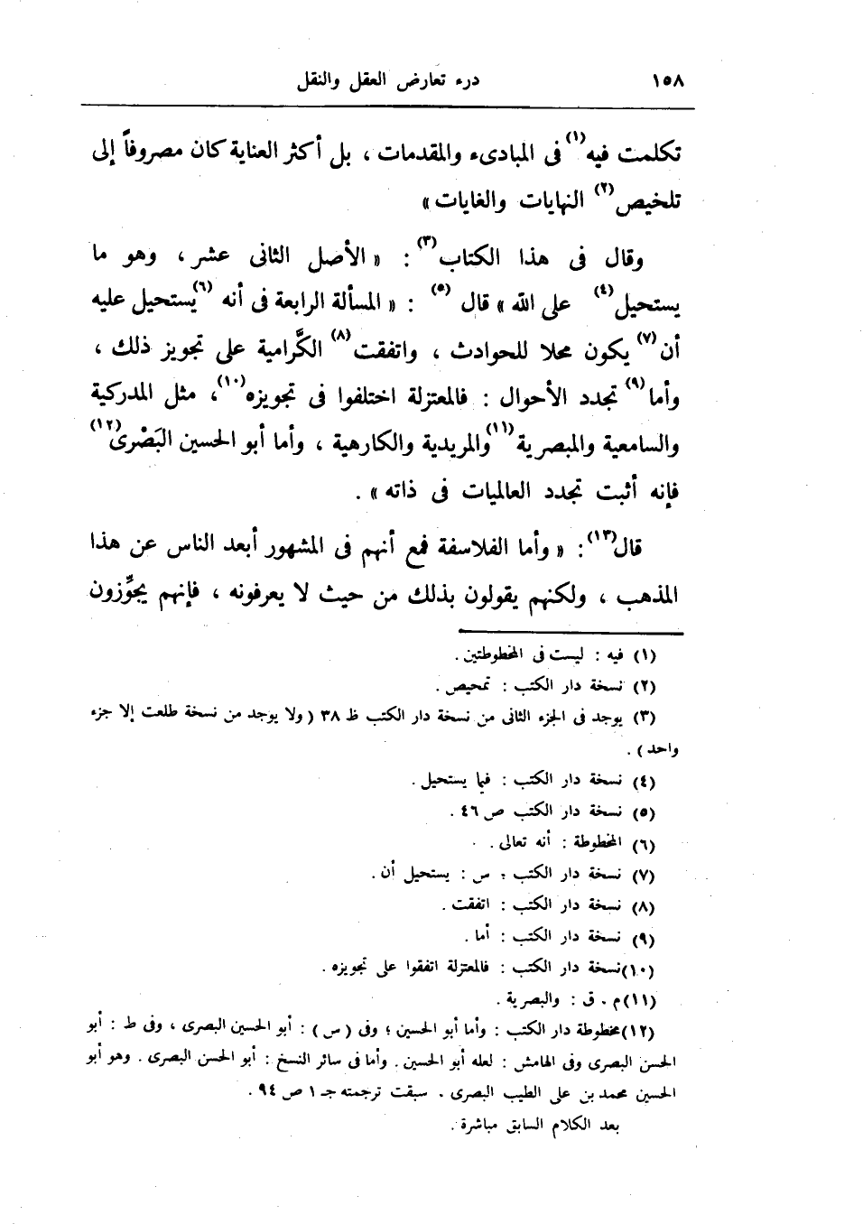 وقال في هذا الكتاب: (الأصل الثاني عشر، وهو ما يستحيل على الله) قال: (المسألة الرابعة في أنه يستحيل عليه أن يكوم محلاً للحوادث، واتفقت الكرامية على تجويز ذلك، وأما تجدد الأحوال: فالمعتزلة اختلفوا في تجويزه، مثل المدركية والسامعية والمبصرية والمريدية والكارهية، وأما أبو الحسين البصري فإنه أثبت تجدد العالميات في ذاته) .