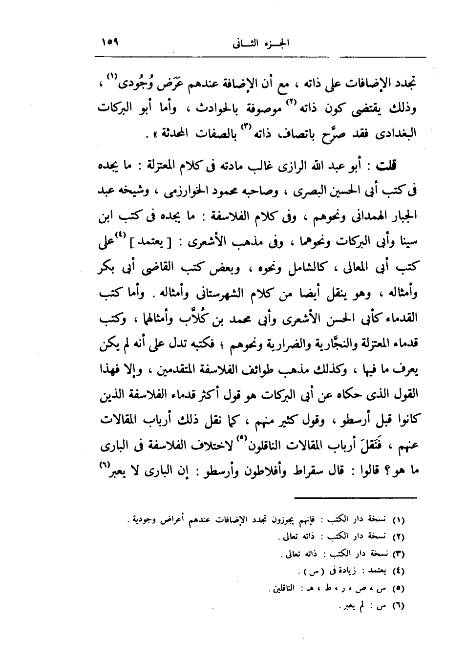 تجدد الإضافات على ذاته، مع أن الإضافة عندهم عرض وجودي، وذلك يقتضي كون ذاته موصوفة بالحوادث، وأما أبو البركات البغدادي فقد صرح باتصاف ذاته بالصفات المحدثة) .