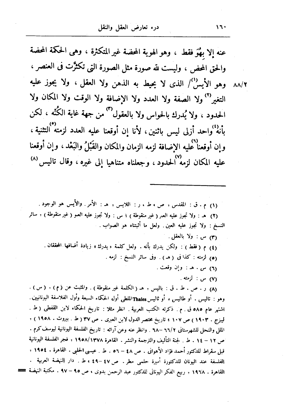عنه إلا بهو فقط، وهو الهوية المحضة غير المتكثرة، وهي الحكمة المحضة والحق المحض، وليست لله صورة مثل الصورة التي تكترث في العنصر، وهو الأيس الذي لا يحيط به الذهن ولا العقل، ولا يجوز عليه التغير ولا الصفة ولا العدد ولا الإضافة ولا الوقت ولا المكان ولا الحدود، ولا يدرك بالحواس ولا بالعقول من جهة غاية الكنه، ولكن بأنه واحد أزلي ليس باثنين، لأنا إن أوقعنا عليه العدد لزمته التثنية، وإن أوقعنا عليه الإضافة لزمه الزمان والمكان والقبل والبعد، وإن أوقعنا عليه المكان لزمه الحدود، وجعلناه متنايهاً إلى غيره، وقال تاليس