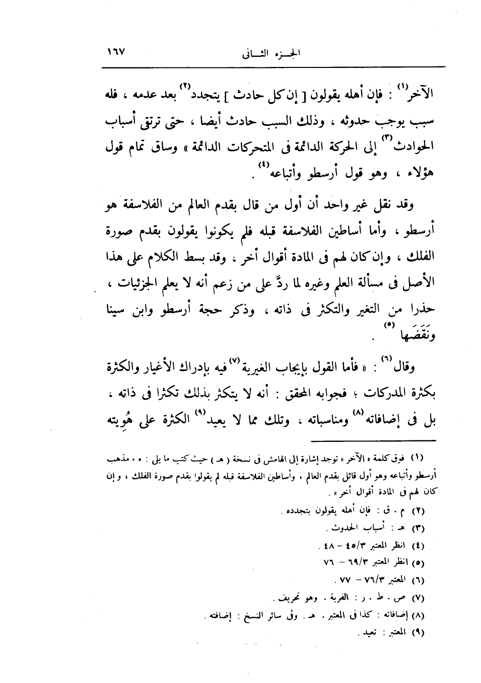 الآخر: فإن أهله يقولون إن كل حادث يتجدد بعد عدمه، فله سبب يوجب حدوثه، وذلك السبب حادث أيضاً، حتى ترتقي أسباب الحوادث إلى الحركة الدائمة في المتحركات الدائمة) وساق تمام قول هؤلاء، وهو قول أرسطو وأتباعه.