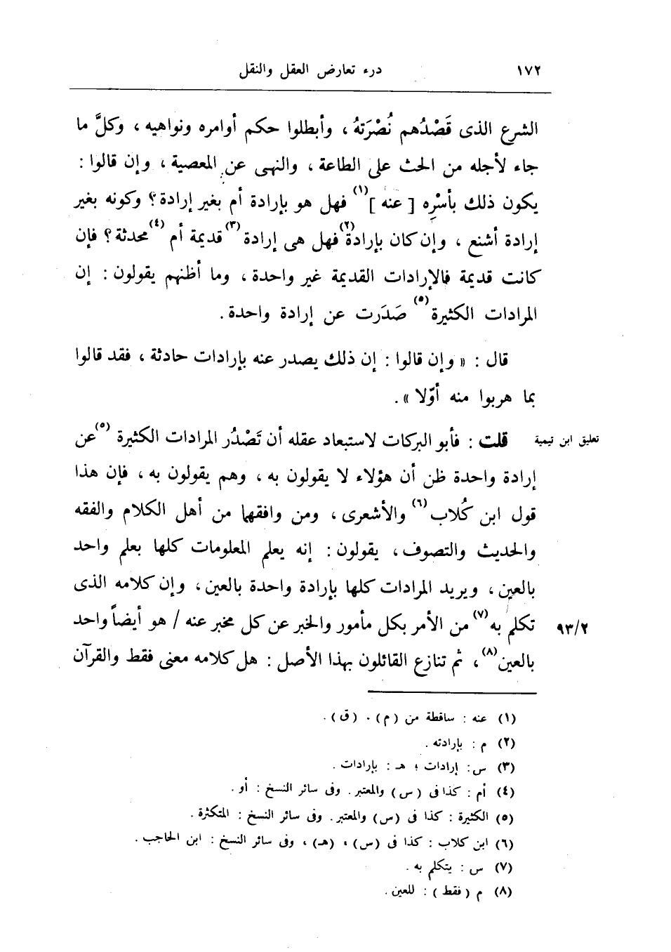 قلت: فأبو البركات لاستبعاد عقله أن تصدر المرادات الكثيرة عن إرادة واحدة ظن أن هؤلاء لا يقولون به، وهم يقولون به، فإن هذا قول ابن كلاب والأشعري ومن وافقهما من أهل الكلام والفقه والحديث والتصوف، يقولون: إنه يعلم المعلومات كلها بعلم واحد بالعين، ويريد المرادات كلها بإرادة واحدة بالعين، وإن كلامه الذي تكلم به من الأمر بكل مأمور والخبر عن كل مخبر عنه هو أيضاً واحد بالعين، ثم تنازع القائلون بهذا الأصل: هل كلامه معنى فقط والقرآن