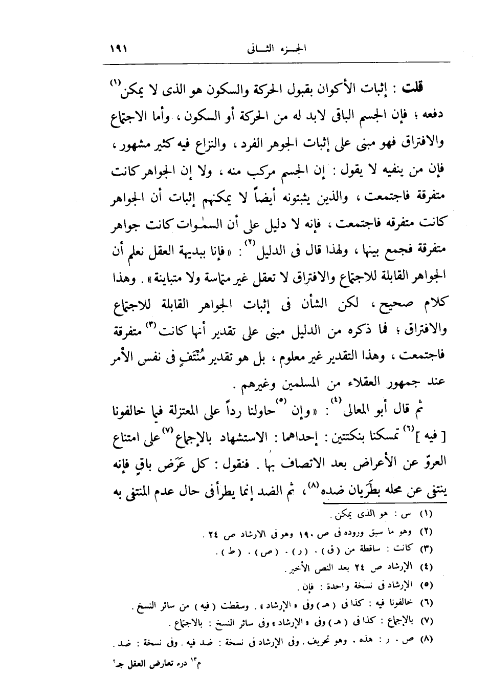 قلت: أثبات الأكوان بقبول الحركة والسكون هو الذي لا يمكن دفعه، فإن الجسم الباقي لا بد له من الحركة أو السكون، وأما الأجتماع والافتراق فهو مبني على إثبات الجوهر الفرد، والنزاع فيه كثير مشهور، فإن من ينفيه لا يقول: إن الجسم مركب منه، ولا إن الجوهر كانت متفرقة فاجتمعت، والذين يثبتونه أيضاً لا يمكنهم إثبات أن الجواهر كانت متفرقة فاجتمعت، فإنه لا دليل على أن السماوات كانت جواهر متفرقة فجمع بينها، ولهذا قال في الدليل: (فإنا ببديهة العقل نعلم أن الجواهر القابلة للاجتماع والافتراق لا تعقل غير متماسة ولا متباينة) .