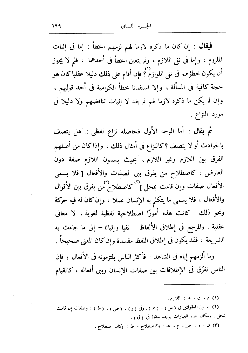 ثم يقال: أما الوجه الأول فحاصله نزاع لفظي: هل يتصف بالحوادث أو لا يتصف؟ كالنزاع في أمثال ذلك، وإذا كان من أصلهم الفرق بين اللازم وغير اللازم، بحيث يسمون اللازم صفة دون العارض، كاصطلاح من يفرق بين الصفات والأفعال فلا يسمى الأفعال صفات وإن قامت بمحل كاصطلاح من يفرق بين الأقوال والأفعال، فلا يسمى ما يتكلم به الإنسان عملاً، وإن كان له فيه حركة ونحو ذلك - كانت هذه أموراً اصطلاحية لفظية لغوية، لا معاني عقلية، والمرجح في إطلاق الألفاظ - نفياً وإثباتاً - إلى ما جاءت به الشريعة، فقد يكون في إطلاق اللفظ مفسدة وإن كان المعنى صحيحاً.