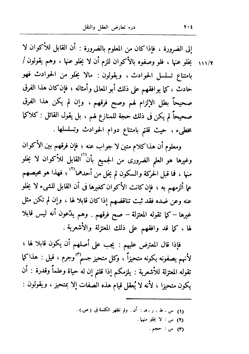 إلى الضرورة، فإذا كان من المعلوم بالضرورة: أن القابل للأكوان لا يخلو عنها، فلو وصفوه بالأكوان للزم أن لا يخلو عنها، وهم يقولون بامتناع تسلسل الحوادث، ويقولون: ما لا يخلو من الحوادث فهو حادث، كما يوافقهم على ذلك أبو المعالي وأمثاله، فإن كان هذا الفرق صحيحاً بطل الإلزام وصح فرقهم، وإن لم يكن هذا الفرق صحيحاً لم يكن في ذلك حجة للمنازع لهم، بل يقول القائل: كلاكما مخطىء، حيث قلتم بامتناع دوام الحوادث وتسلسلها.