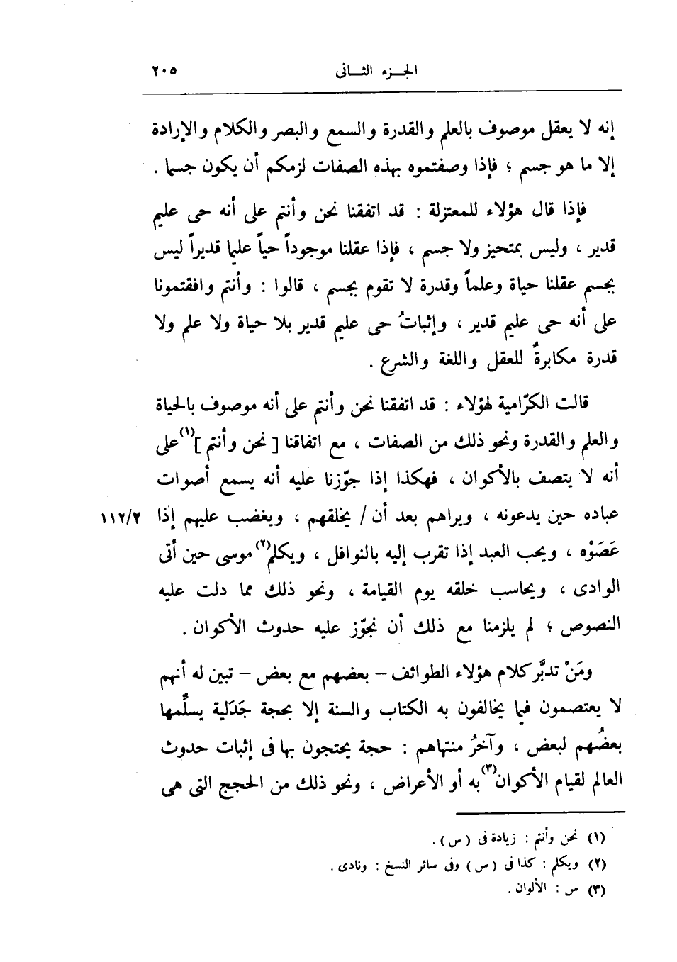 فإذا قال هؤلاء للمعتزلة: قد اتفقنا نحن وأنتم على أنه حي عليم قدير، وليس بمحيز ولا جسم، فإذا عقلنا موجوداً حياً عليماً قديراً ليس بجسم عقلنا حياة وعلماً وقدرة لا تقوم بجسم، قالوا: وأنتم وافقتمونا على أنه حي عليم قدير، وإثبات حي عليم قدير بلا حياة ولا علم ولا قدرة مكابرة للعقل واللغة والشرع.