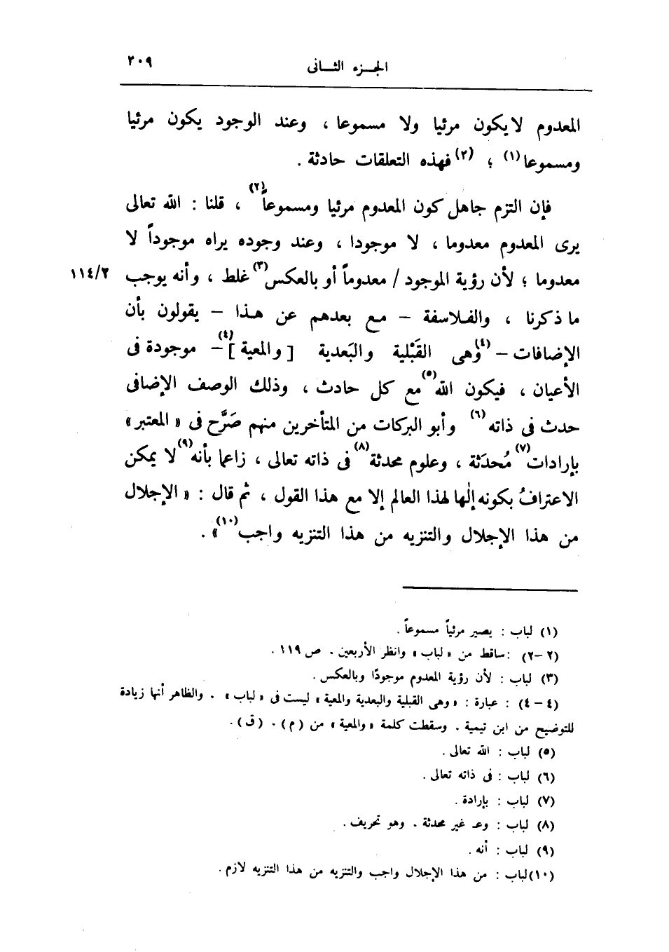 فإن التزام جاهل كون المعدوم مرئياً ومسموعاً، قلنا: الله تعالى يرى المعدوم معدوماً، لا موجوداً، وعند وجوده يراه موجوداً لا معدوماً، لأن رؤية الموجود معدوماً أو بالعكس غلط، وأنه يوجب ما ذكرنا، والفلاسفة - مع بعدهم عن هذا - يقولون بأن الإضافات - وهي القبلية والبعدية والمعية - موجودة في الأعين، فيكون الله مع كل حادث، وذلك الوصف الإضافي حدث في ذاته وأبو البركات من المتأخرين منهم صرح في المعتبر بإرادات محدثة، وعلوم محدثة في ذاته تعالى، زاعماً بأنه لا يمكن الاعتراف بكونه إلهاً لهذا العالم إلا مع هذا القول، ثم قال: (الإجلال من هذا الإجلال والتنزيه من هذا التنزيه واجب) .