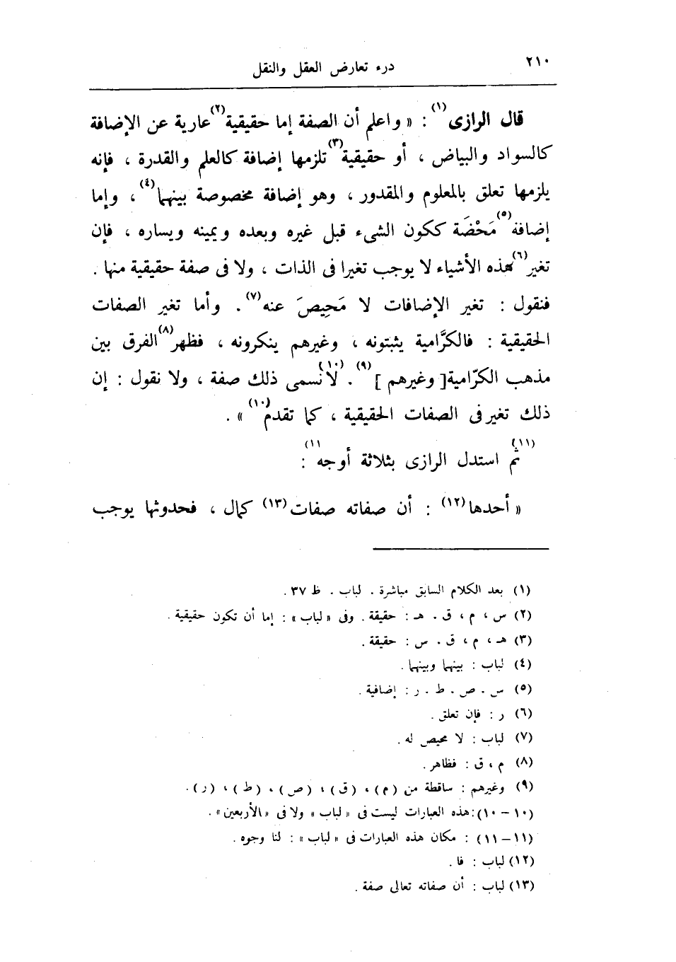 قال الرازي: (واعلم أن الصفة إما حقيقية عارية عن الإضافة كالسواد والبياض، أو حقيقة تلزمها إضافة كالعلم والقدرة، فإنه يلزمها تعلق بالمعلوم والمقدور، وهو إضافة مخصوصة بينهما، وإما إضافة محضة ككون الشيء قبل غيره وبعده ويمينه ويساره، فإن تغير هذه الأشياء لا يوجب تغيراً في الذات، ولا في صفة حقيقية منها.