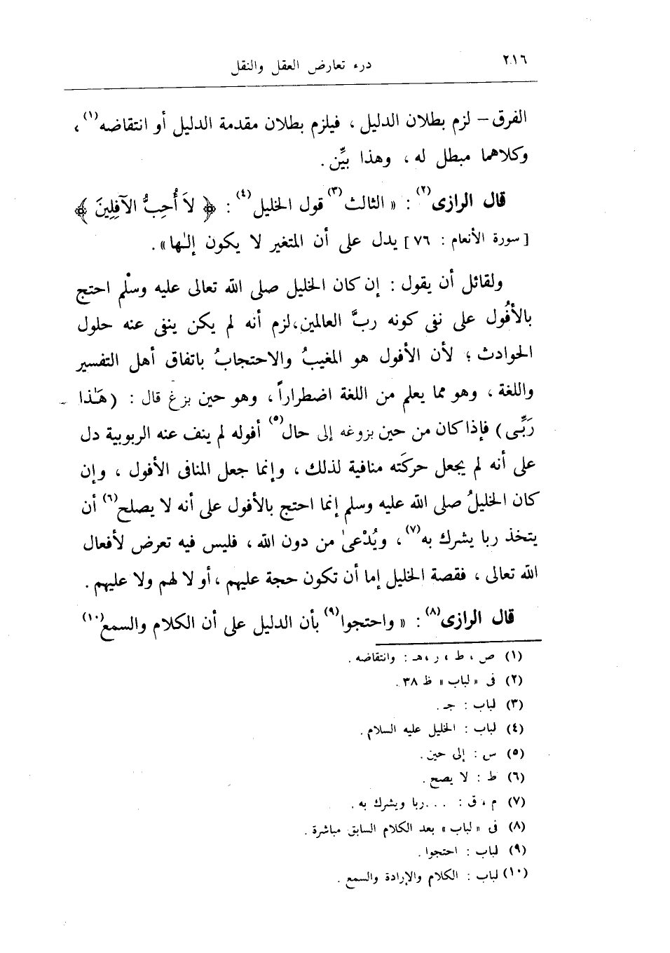 قال الرازي: (الثالث قول الخليل: {لا أحب الأفلين} (الأنعام: 67) يدل على أن المتغير لا يكون إلهاً) .