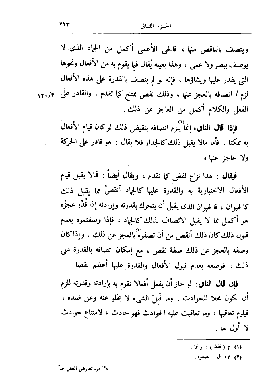 ويتصف بالناقص منها، فالحي الأعمى أكمل من الجماد الذي لا يوصف ببصر ولا عمى، وهذا بعينه يقال فيما يقوم به من الأفعال ونحوها التي يقدر عليها ويشاؤها، فإنه لو لم يتصف بالقدرة على هذه الأفعال لزم اتصافه بالعجز عنها، وذلك نقص ممتنع كما تقدم، والقادر على الفعل والكلام أكمل من العاجز عن ذلك.