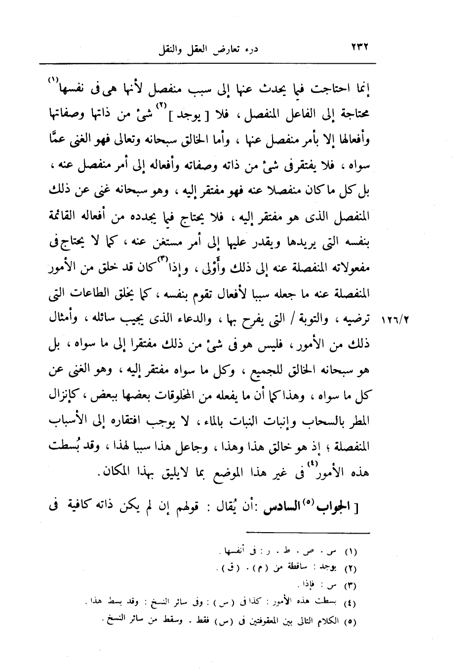 إنما احتاجت فيما يحدث عنها إلى سبب منفصل لأنها هي في نفسها محتاجة إلى الفاعل المنفصل، فلا يوجد شيء من ذاته وصفاتها وأفعالها إلا بأمر منفصل عنها، وأما الخالق سبحانه وتعالى فهو الغني عما سواه، فلا يفتقر في شيء من ذاته وصفاته وأفعاله إلى أمر منفصل الذي هو مفتقر إليه، فلا يحتاج فيما يجدده من أفعاله القائمة بنفسه التي يريدها ويقدر عليها إلى أمر مستغن عنه، كما لا يحتاج في مفعولاته المنفصلة عنه إلى ذلك وأولى، وإذا كان قد خلق من الأمور المنفصلة عنه ما جعله سبباً لأفعال تقوم بنفسه، كما يخلق الطاعات التي ترضيه، والتوبة التي يفرح بها، والدعاء الذي يجيب سائله، وأمثال ذلك من الأمور، فليس هو في شيء من ذلك مفتقراً إلى ما سواه، بل هو سبحانه الخالق للجميع، وكل ما سواه مفتقر إليه، وهو الغني عن كل ما سواه، وهذا كما أن ما يفعله من المخلوقات بعضها ببعض، كإنزال المطر بالسحاب وإنبات النبات بالماء، لا يوجب افتقاره إلى الأسباب المنفصلة، إذ هو خالق هذا وهذا، وجاعل هذا سبباً لهذا، وقد بسطت هذه الأمور في غير هذا الموضع بما لا يليق بهذا المكان.