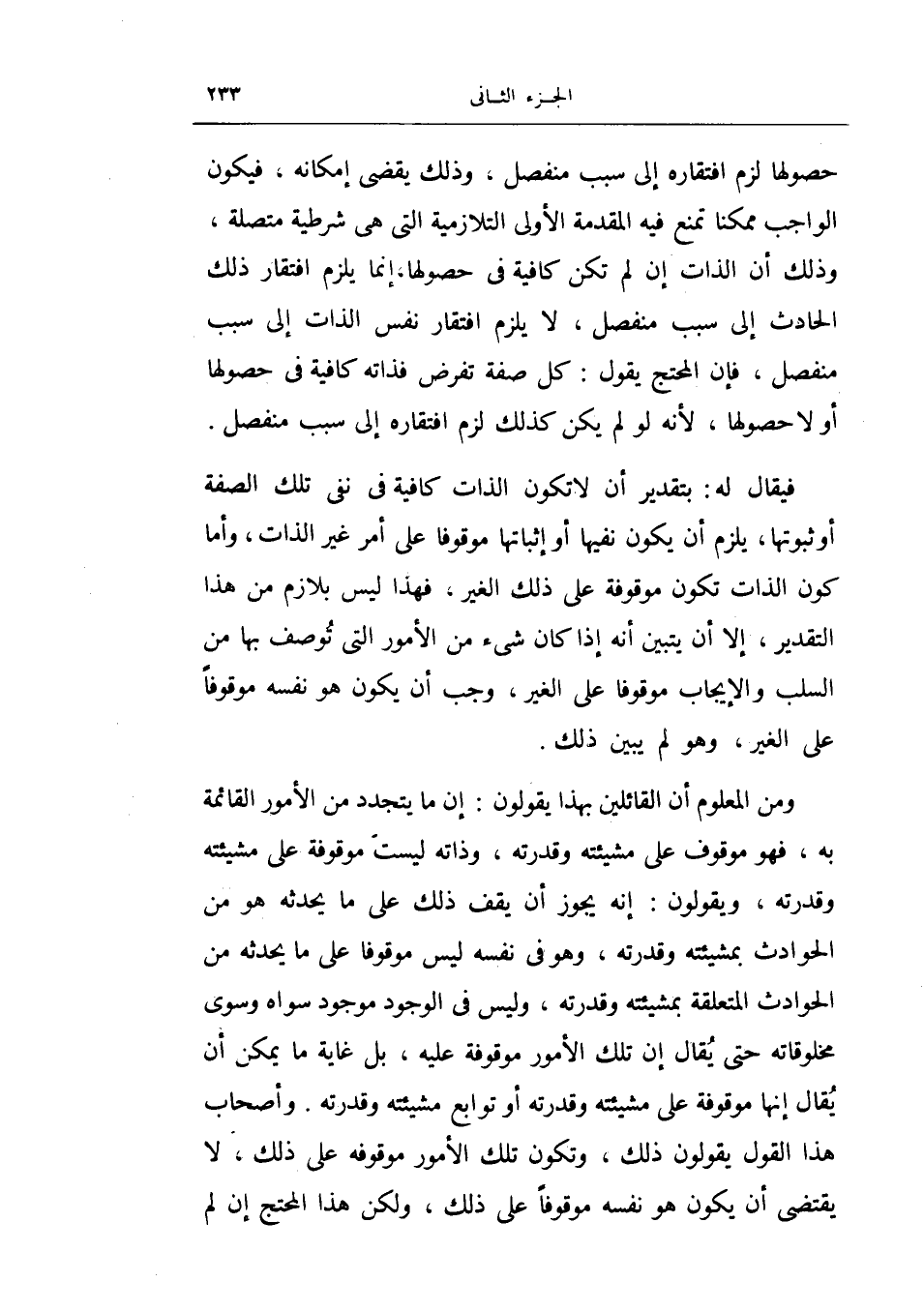 حصولها لزم افتقاره إلى سبب منفصل، وذلك يقضي إمكانه، فيكون الواجب ممكناً تمنع فيه المقدمة الأولى التلازمية التي هي شرطية متصلة، وذلك أن الذات إن لم تكن كافية في حصولها، إنما يلزم افتقار ذلك الحادث إلى سبب منفصل، لا يلزم افتقار نفس الذات إلى سبب منفصل، فإن المحتج يقول: كل صفة تفرض فذاته كافيه في حصولها أو لا حصولها، لأنه لو لم يكن كذلك لزم افتقاره إلى سبب منفصل.