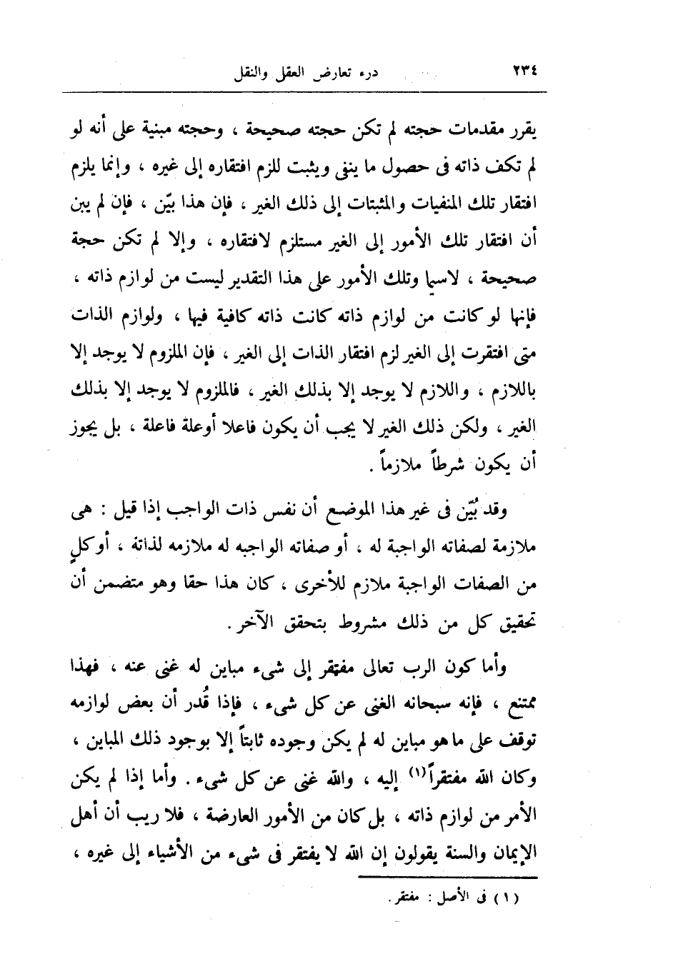 يقرر مقدمات حجته لم تكم حجته صحيحة، وحجته مبنية على أنه لو لم تكف ذاته في حصول ما ينفي ويثبت للزم افتقاره إلى غيره، وإنما يلزم افتقار تلك المنفيات والمثبتات إلى ذلك الغير، فإن هذا بين، فإن لم يبن أن افتقار تلك الأمور إلى الغير مستلزم لافتقاره، وإلا لم تكن حجة صحيحة، لا سيما وتلك الأمور على هذا التقدير ليست من لوازم ذاته، فإنها لو كانت من لوازم ذاته كانت ذاته كافية فيها، ولوازم الذات متى افتقرت إلى الغير لزم افتقار الذات إلى الغير، فإن الملزوم لا يوجد إلا باللازم، واللازم لا يوجد إلا بذلك الغير، فالملزوم لا يوجد إلا بذلك الغير، ولكن ذلك الغير لا يجب أن يكون فاعلاً أو علة فاعلة، بل يجوز أن يكو شرطاً ملازماً.