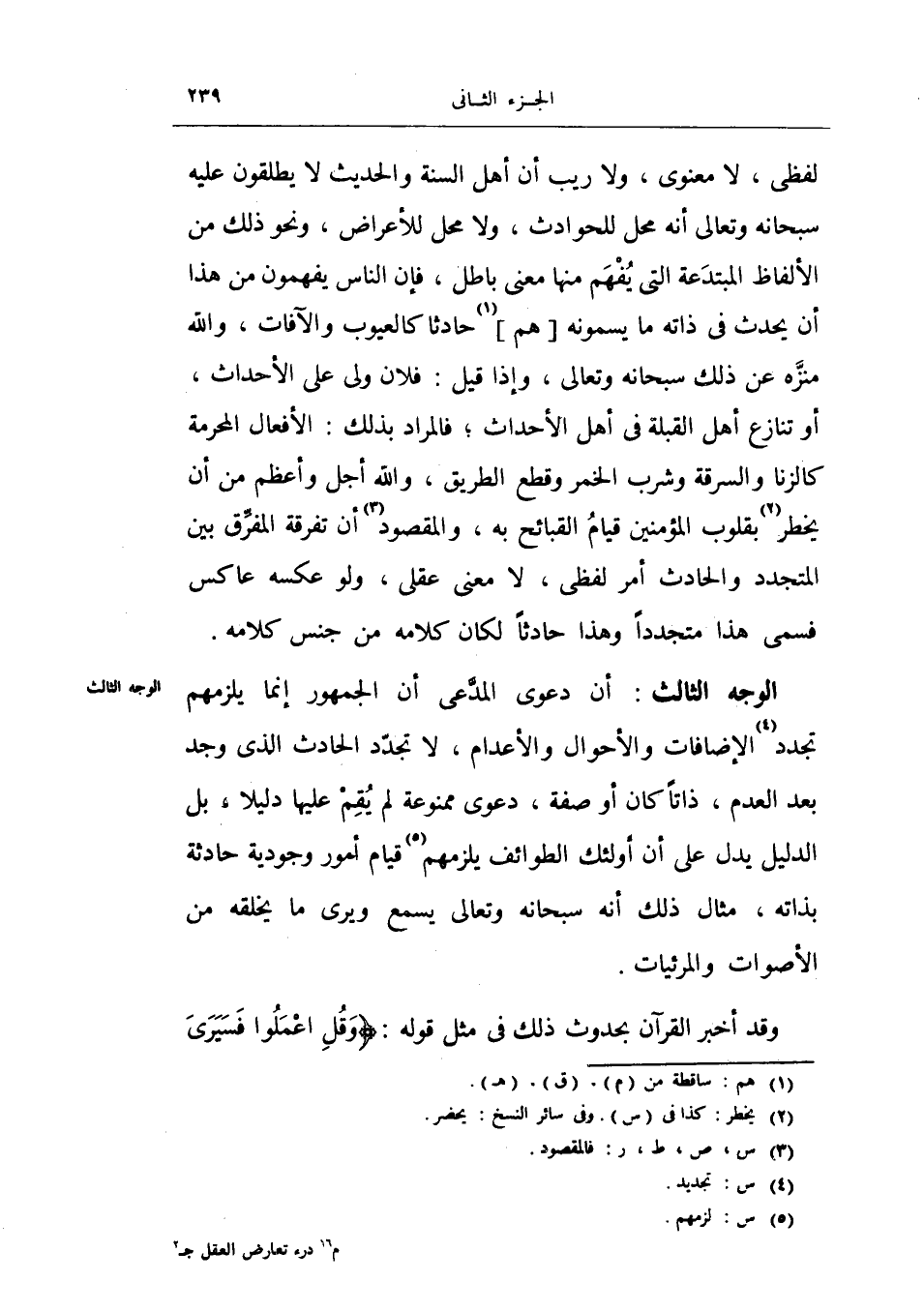 أن دعوى المدعي أن الجمهور إنما يلزمهم تجدد الإضافات والأحوال والأعدام، لا تجدد الحادث الذي وجد بعد العدم، ذاتاً كان أو صفة، دعوى ممنوعة لم يقم عليها دليلاً، بل الدليل يدل على أن أولئك الطوائف يلزمهم قيام أمور وجودية حادث بذاته، مثال ذلك سبحانه وتعالى يسمع ويرى ما يخلقه من الأصوات والمرئيات.