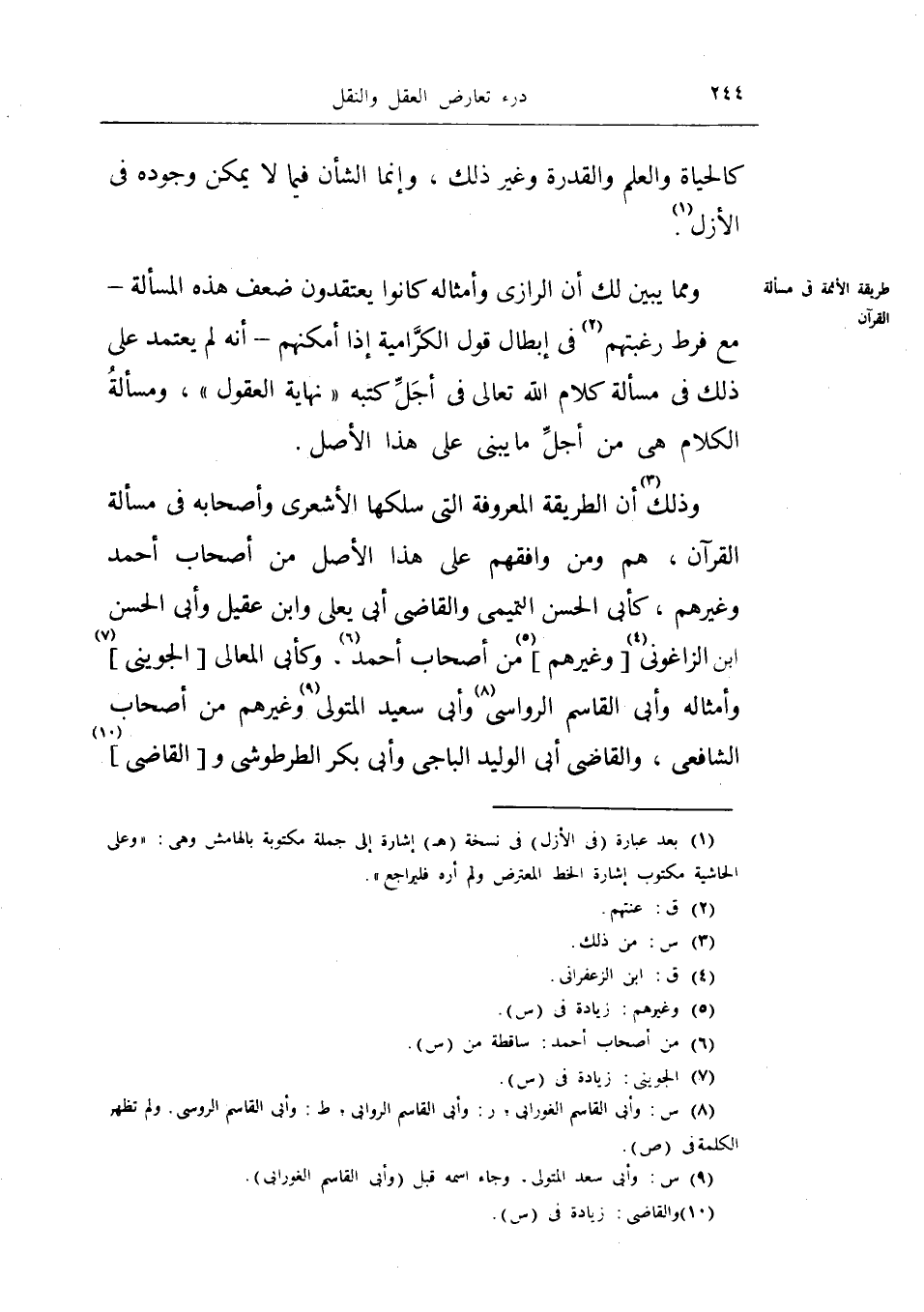 وذلك أن الطريقة المعروفة التي سلكها الأشعري وأصحابه في مسألة القرآن، هم ومن وافقهم على هذا الأصل من أصحاب أحمد وغيرهم، كأبي الحسن التميمي والقاضي أبي يعلى وابن عقيل وأبي الحسن بن الزاغوني وغيرهم من أصحاب أحمد، وكأبي المعالي الجويني وأمثاله وأبي القاسم الرواسي وأبي سعيد المتولي وغيرهم من أصحاب الشافعي، والقاضي أبي الوليد الباجي وأبي بكر الطرطوشي والقاضي