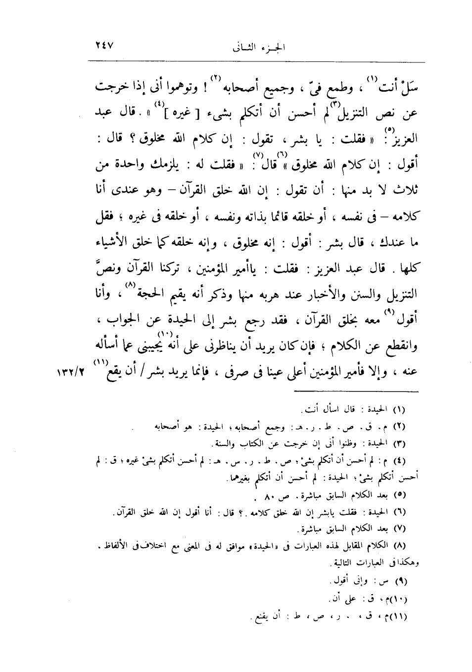 قال عبد العزيز: فقلت: يا أمير المؤمنين، تركنا القرآن ونص التنزيل والسنن والأخبار عند هربه منها وذكر أنه يقيم الحجة، وأنا أقول معه بخلق القرأن، فقد رجع بشر إلى الحيدة عن الجواب، وانقطع عن الكلام، فإن كان يريد أن يناظرني على أنه يجيبني عما أسأله عنه، وإلا فأمير المؤمنين أعلى عيناً في صرفي، فإنما يريد بشر أن يقع