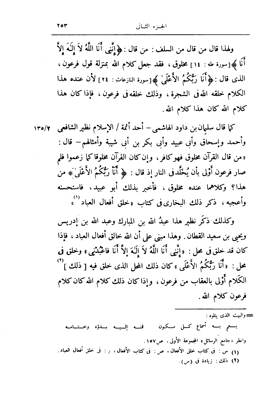 كما قال سليمان بن داود الهاشمي - أحد أئمة الإسلام نظير الشافعي وأحمد وإسحاق وأبي عبيد وأبي بكر بن أبي شيبة وأمثالهم - قال: (من قال القرآن مخلوق فهو كافر، وإن كان القرآن مخلوقاً كما زعموا فلم صار فرعون أولى بأن يخلد في النار إذ قال: {أنا ربكم الأعلى} من هذا؟ وكلاهما عنده مخلوق، فأخبر بذلك أبو عبيد، فاستحسنه وأعجبه، ذكر ذلك البخاري في كتاب خلق أفعال العباد.