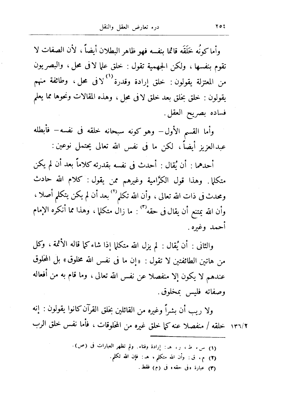 وأما كونه خلقه قائماً بنفسه فهو ظاهر البطلان أيضاً، لأن الصفات لا تقوم بنفسها، ولكن الجهمية تقول: خلق علماً لا في محل، والبصريون من المعتزلة يقولون: خلق إرادة وقدرة لا في محل، وطائفة منهم يقولون: خلق بخلق بعد خلق لا في محل، وهذه المقالات ونحوها مما يعلم فساده بصريح العقل.