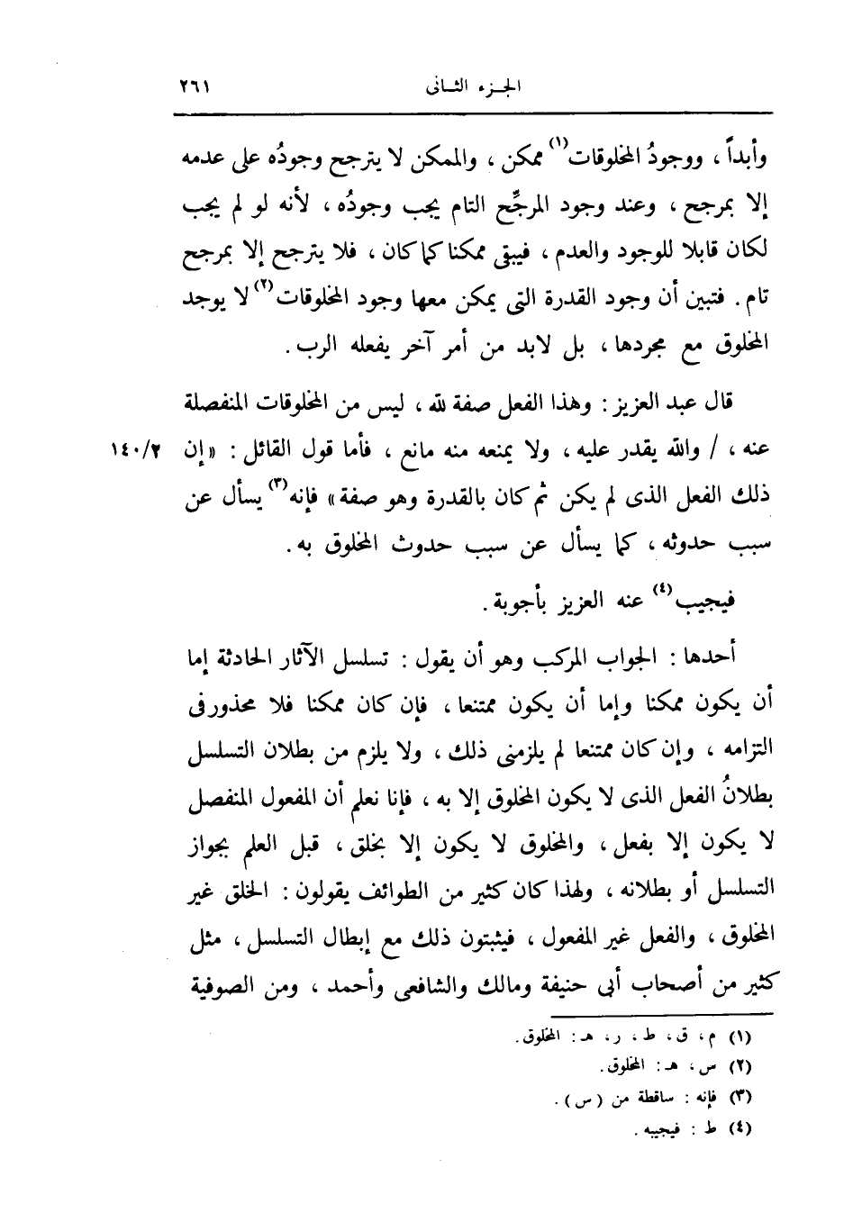 قال عبد العزيز: وهذا الفعل صفة لله، ليس من المخلوقات المنفصلة عنه، والله يقدر عليه، ولا يمنعه منه مانع، فأما قول القائل: (إن ذلك الفعل الذي لم يكن ثم كان بالقدرة وهو صفة) فإنه يسأل عن سبب حدوثه، كما يسأل عن سبب حدوث المخلوق به.