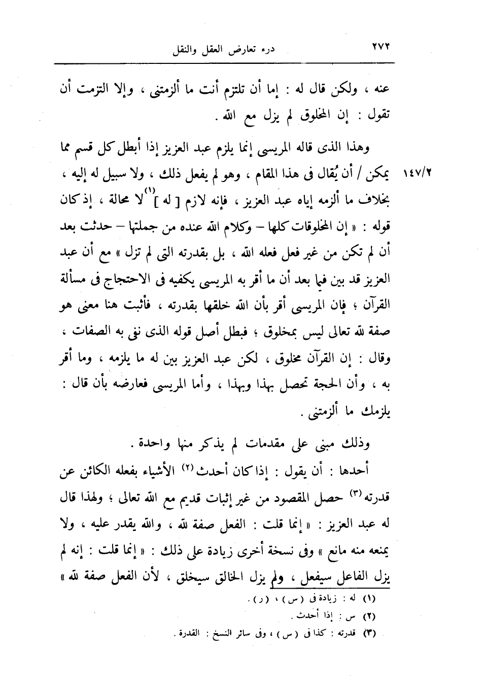 وهذا الذي قاله المريسي إنما يلزم عبد العزيز إذا أبطل كل قسم مما يمكن أن يقال في هذا المقام، وهو لم يفعل ذلك، ولا سبيل له إليه، بخلاف ما ألزمه إياه عبد العزيز، فإنه لازم له لامحالة، إذ كان قوله: (إن المخلوقات كلها - وكلام الله عنده من جملتها - حدثت بعد أن لم تكن من غير فعل فعله الله، بل بقدرته التي لم تزل) مع أن عبد العزيز قد بين فيما بعد أن ما أقر به المريسي يكفيه في الاحتجاج في مسألة القرآن، فإن المريسي أقر بأن الله خلقها بقدرته، فأثبت هنا معنى هو صفة لله تعالى ليس بمخلوق، فبطل أصل قوله الذي نفى به الصفات، وقال: إنا القرآن مخلوق، لكن عبد العزيز بين له ما يلزمه، وما أقر به، وأن الحجة تحصل بهذا وبهذا، وأما المريسي فعارضه بأن قال: يلزمك ما ألزمتني.