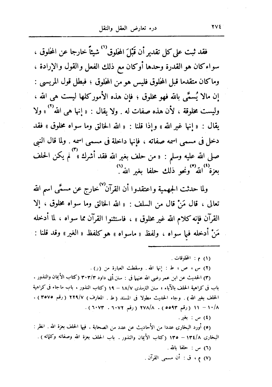 ولما حدثت الجهمية واعتقدوا أن القرآن خارج عن مسمى اسم الله تعالى، قال من قال من السلف: (الله الخالق وما سواه مخلوق، إلا القرآن فإنه كلام الله غير مخلوق) ، فاستثنوا القرآن مما سواه، لما أدخله من أدخله فيما سواه، ولفظ (ما سواه) هو كلفظ (الغير) وقد قلنا: