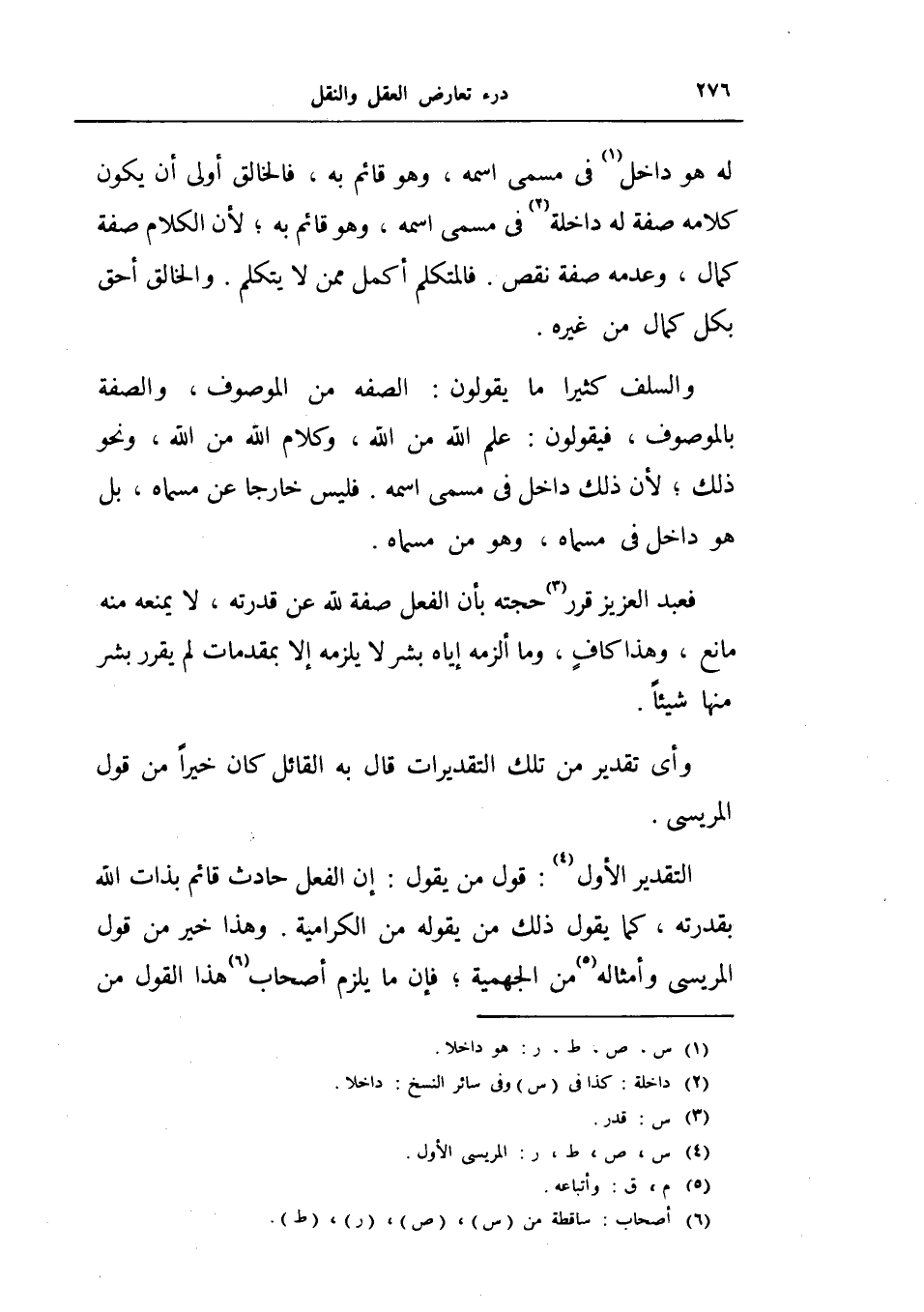 التقدير الأول: قول من يقول: إن الفعل حادث قائم بذات الله بقدرته، كما يقول ذلك من يقوله من الكرامية.