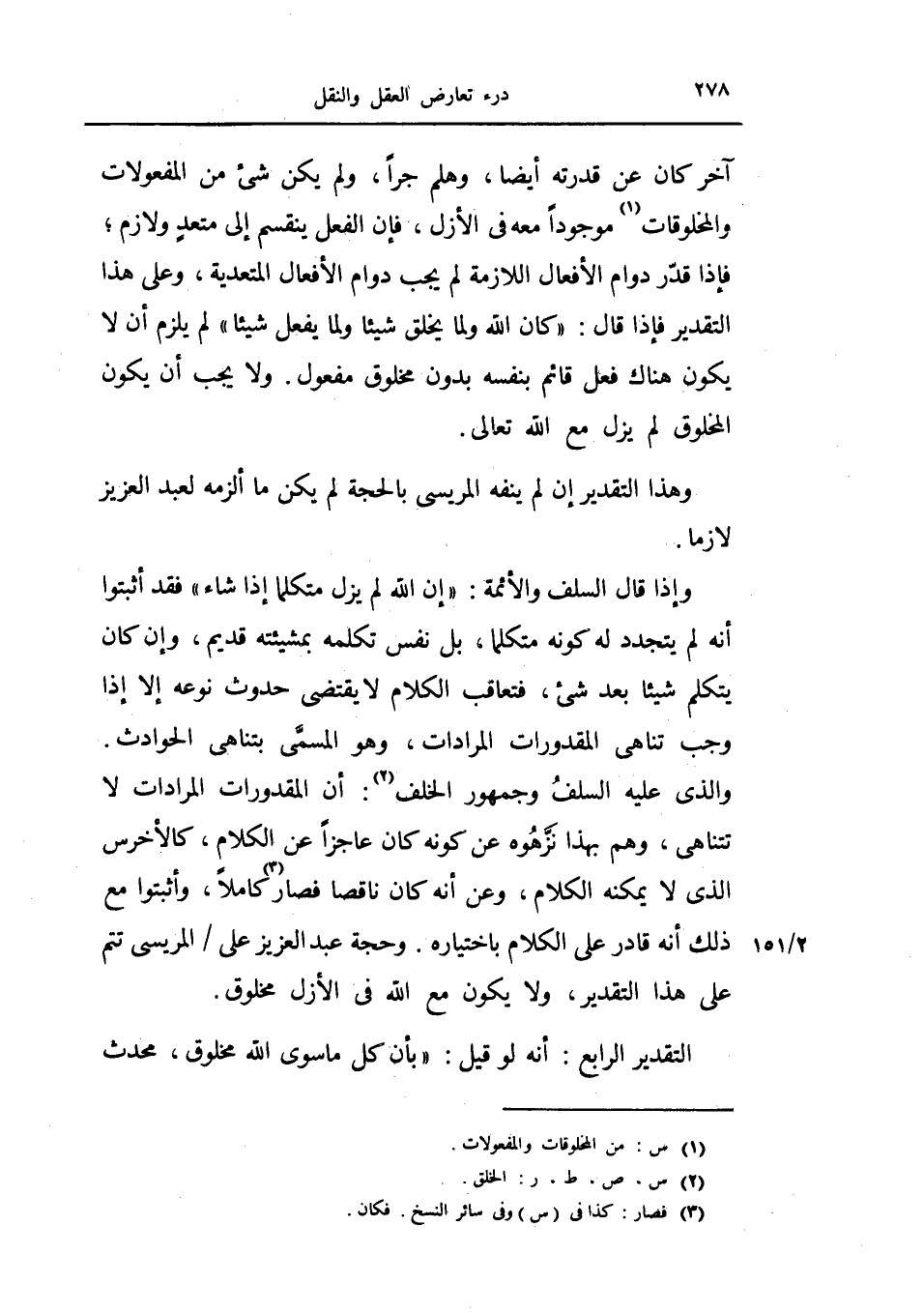 وإذا قال السلف والأئمة: (إن الله لم يزل متكلماً إذا شاء) فقد أثبتوا أنه لم يتجدد له كونه متكلماً، بل نفس تكلمه بمشيئته قديم، وإن كان يتكلم شيئاً بعد شيء، فتعاقب الكلام لا يقتضي حدوث نوعه إلا إذا وجب تناهي المقدورات المرادات، وهو المسمى بتناهى الحوادث.
