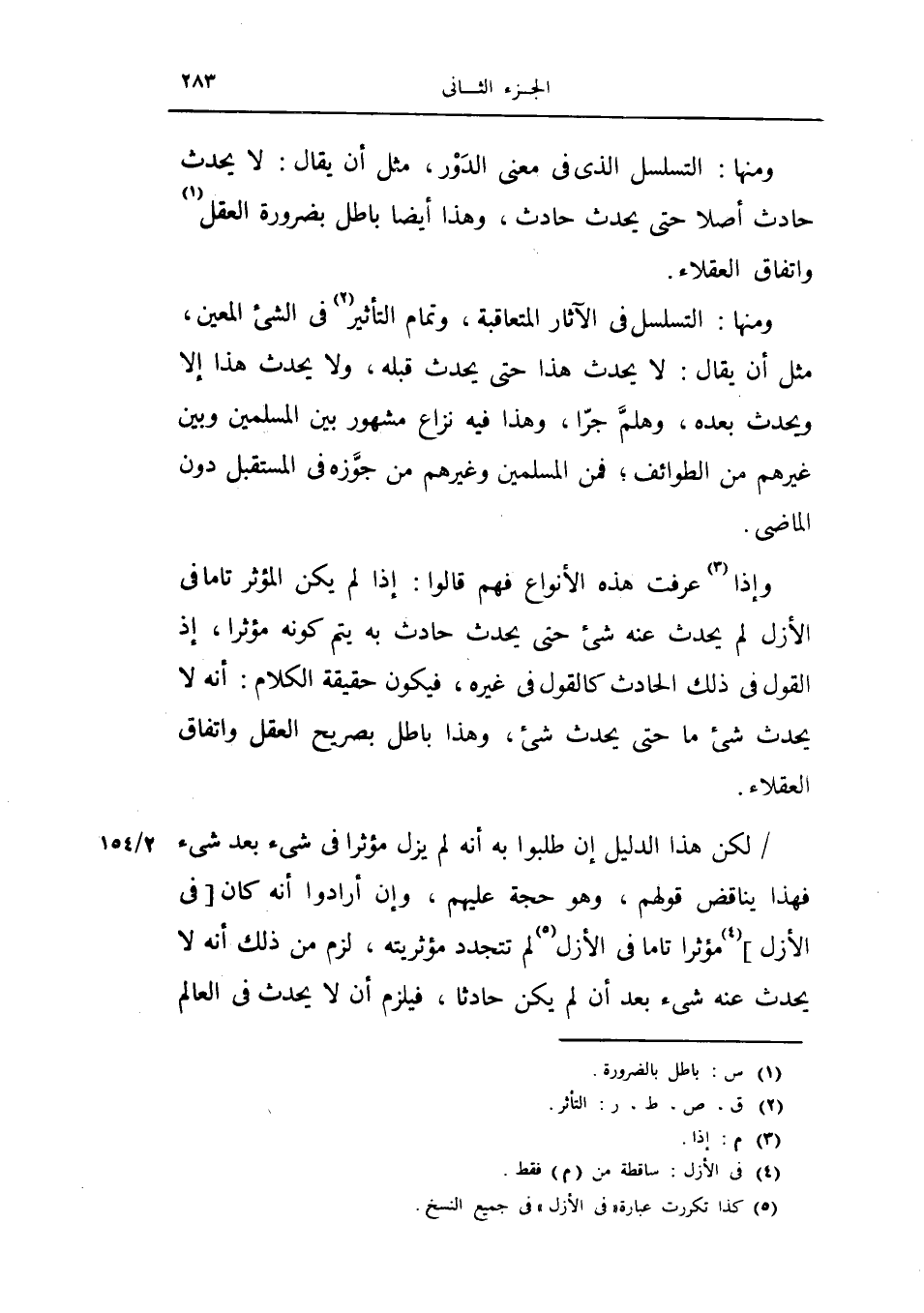 وإذا عرفت هذه الأنواع قالوا: إذا لم يكن المؤثر تاماً في الأزل لم يحدث عنه شيء حتى يحدث حادث به يتم كونه مؤثراً، إذ القول في ذلك الحادث كالقول في غيره، فيكون حقيقة الكلام: أنه لا يحدث شيء ما حتى يحدث شيء، وهذا باطل بصريح العقل واتفاق العقلاء.