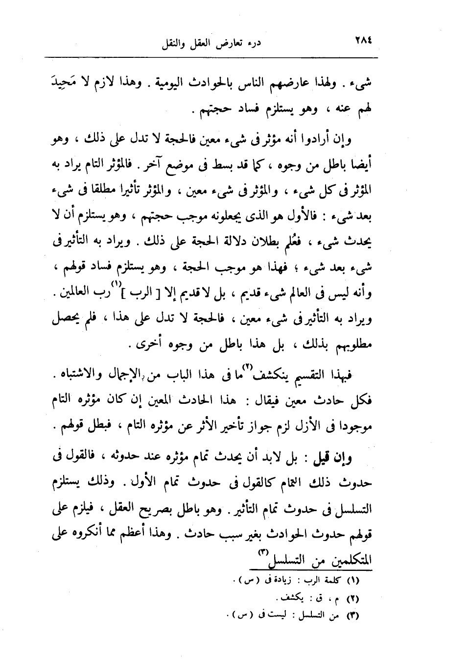 فالمؤثر التام يراد به المؤثر في كل شيء، والمؤثر في شيء معين، والمؤثر تأثيراً مطلقاً في شيء بعد شيء: فالأول هو الذي يجعلونه موجب حجتهم، وهو يستلزم أن لا يحدث شيء، فعلم بطلان دلالة الحجة على ذلك.