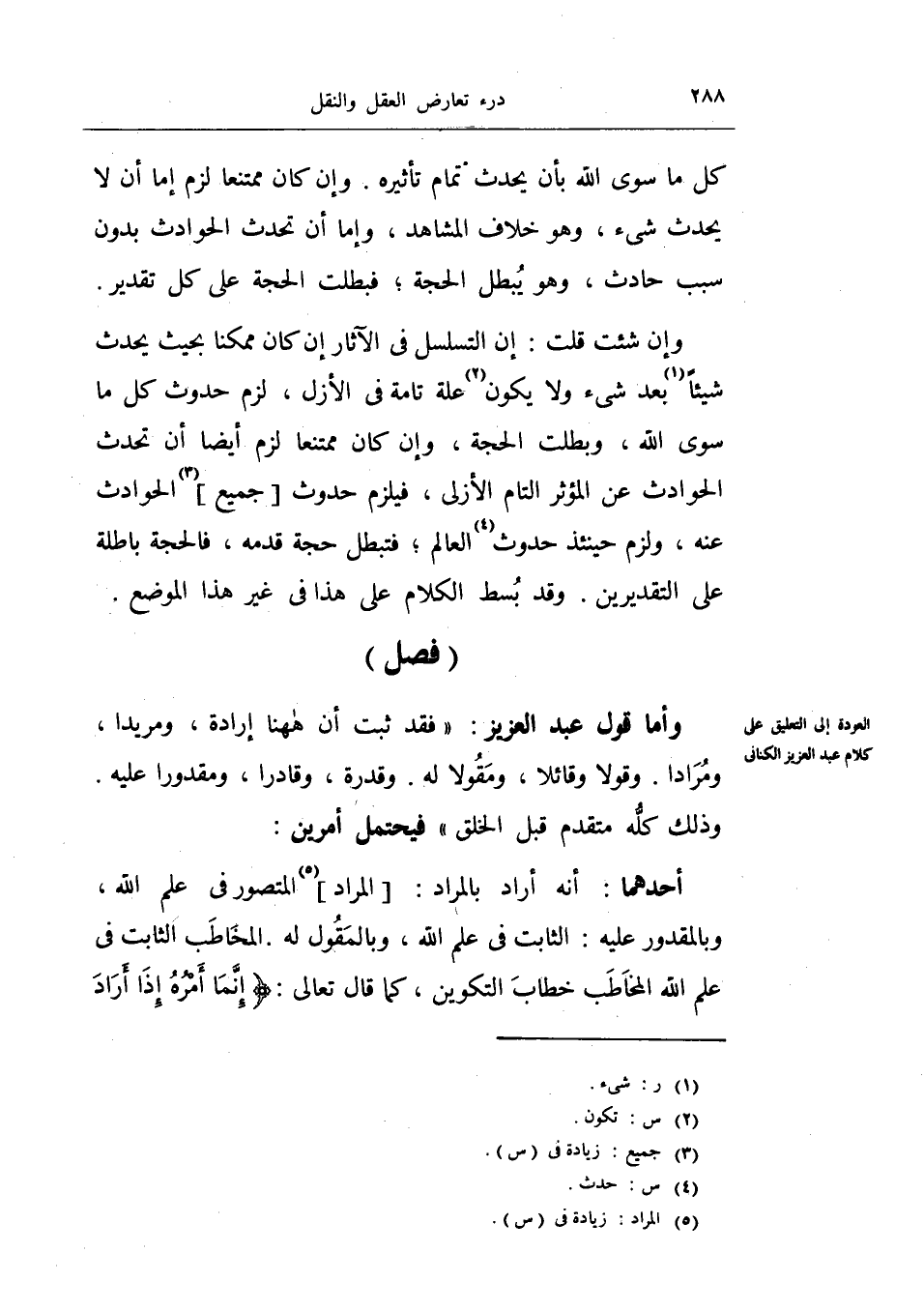 وإن شئت قلت: إن التسلسل في الآثار إن كان ممكناً بحيث يحدث شيئاً بعد شيء ولا يكون علة تامة في الازل، لزم حدوث كل ما سوى الله، وبطلت الحجة، وإن كان ممتنعاً لزم أيضاً أن تحدث الحوادث عن المؤثر التام الأزلي، فيلزم حدوث جميع الحوادث عنه، ولزم حينئذ حدوث العالم، فتبطل حجة قدمه، فالحجة باطلة على التقديرين.