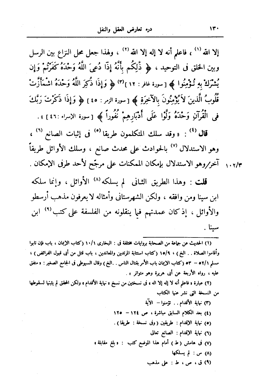 قلت: وهذا الطريق الثاني لم يسلكه الأوائل، وإنما سلكه ابن سينا ومن وافقه ولكن الشهرستاني وأمثاله لا يعرفون مذهب أرسطو والأوائل إذ كان عمدتهم فيما ينقلونه من الفلسفة على كتب ابن سينا.