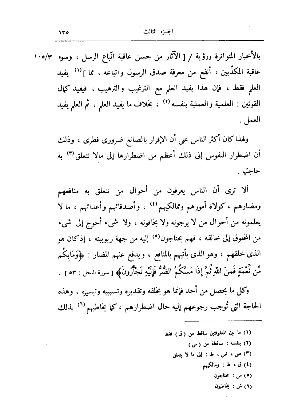ألا ترى أن الناس يعرفون من أحوال من تتعلق به منافعهم ومضارهم، كولاة أمورهم وممالكيهم، وأصدقائهم وأعدائهم، مالا يعلمونه من أحوال من لا يرجونه ولا يخافونه، ولا شيء أحوج إلى شيء من المخلوق إلى خالقه فهم يحتاجون إليه من جهة ربوبيته، إذ كان هو الذي خلقهم، وهو الذي يأتيهم بالمنافع، ويدفع عنهم المضار: {وما بكم من نعمة فمن الله ثم إذا مسكم الضر فإليه تجأرون} النحل 53.