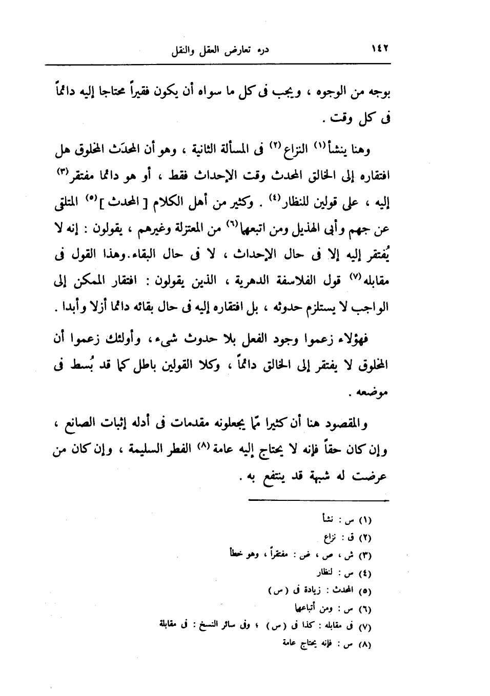 وكثير من أهل الكلام المحدث المتلقى عن جهم وأبي الهذيل ومن تبعهما من المعتزلة وغيرهم، يقولون إنه لا يفتقر إليه إلا في حال الإحداث لا في حال البقاء وهذا القول في مقابلة قول الفلاسفة الدهرية، الذين يقولون: افتقار الممكن إلى الواجب لا يستلزم حدوثه بل افتقاره إليه في حال بقائه دائماً ازلاً وأبداً.