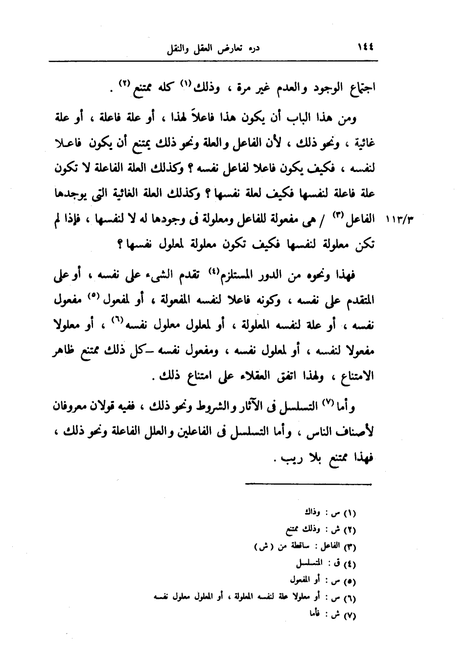 ومن هذا الباب أن يكون هذا فاعلاً لهذا، او علة فاعلة أو علة غائية، ونحو ذلك لأن الفاعل والعلة ونحو ذلك يمتنع أن يكون فعلاً لنفسه، فكيف يكون فاعلاً لفاعل نفسه؟ وكذلك العلة الفاعلة لا تكون علة فاعلة لنفسها فكيف لعلة نفسها؟ وكذلك العلة الغائية التي يوجدها الفاعل هي مفعولة للفاعل ومعلولة في وجودها له لا لنفسها، فإذا لم تكن معلولة لنفسها فكيف تكون معلولة لمعلول نفسها؟