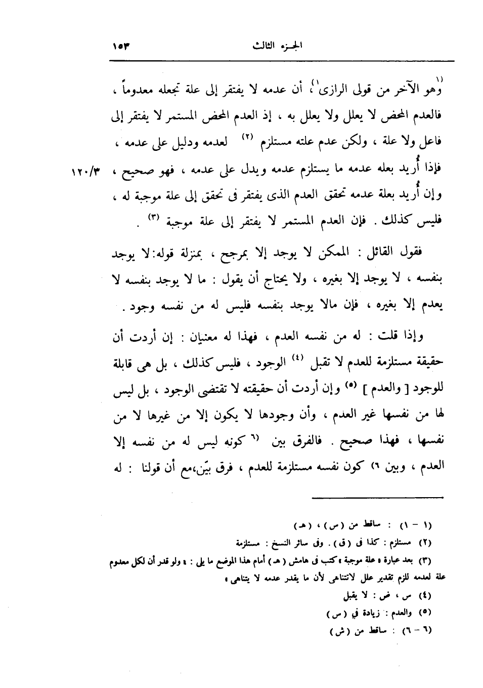 وهو الآخر من قولي الرازي أن عدمه لا يفتقر إلى علة تجعله معدوماً فالعدم المحض لا يعلل ولا يعلل به إذ العدم المحض المستمر لا يفتقر إلى فاعل ولا علة ولكن عدم علته مستلزم لعدمه ودليل على عدمه فإذا أريد بعلة عدمه ما يستلزم عدمه ويدل على عدمه فهو صحيح وإن أريد بعلة عدمه تحقق العدم الذي يفتقر في تحقق إلى علة موجبة له فليس كذلك فإن العدم المستمر لا يفتقر إلى علة موجبة.