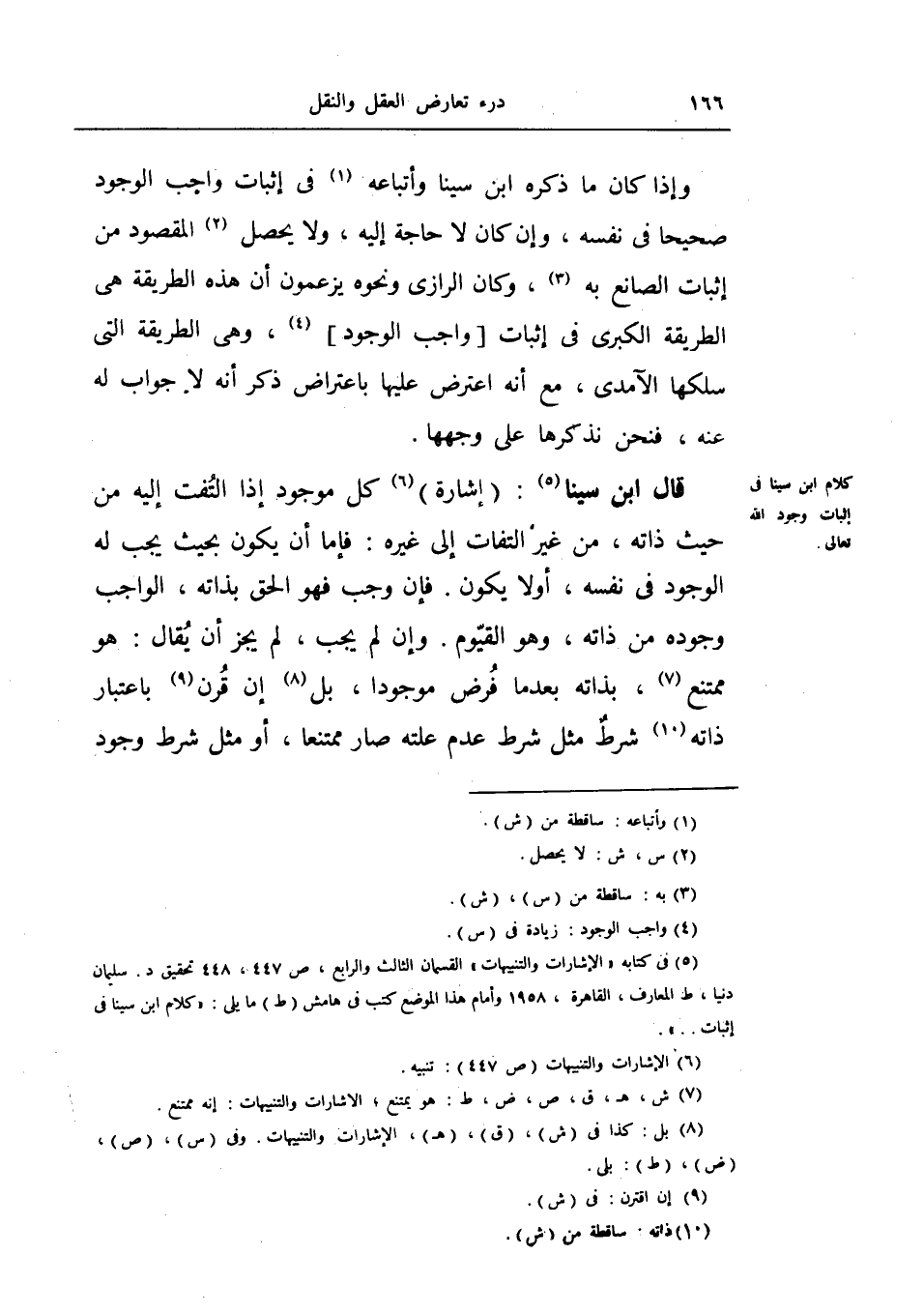 وإذا كان ما ذكره ابن سينا وأتباعه في إثبات واجب الوجود صحيحاً في نفسه، وإن كان لا حاجة إليه ولا يحصل المقصود من إثبات الصانع به، وكان الرازي ونحوه يزعمون أن هذه الطريقة هي الطريقة الكبرى في إثبات واجب الوجود، وهي الطريقة التي سلكها الآمدي مع أنه اعترض عليها باعتراض ذكر أنه لا جواب له عنه فنحن نذكرها على وجهها.