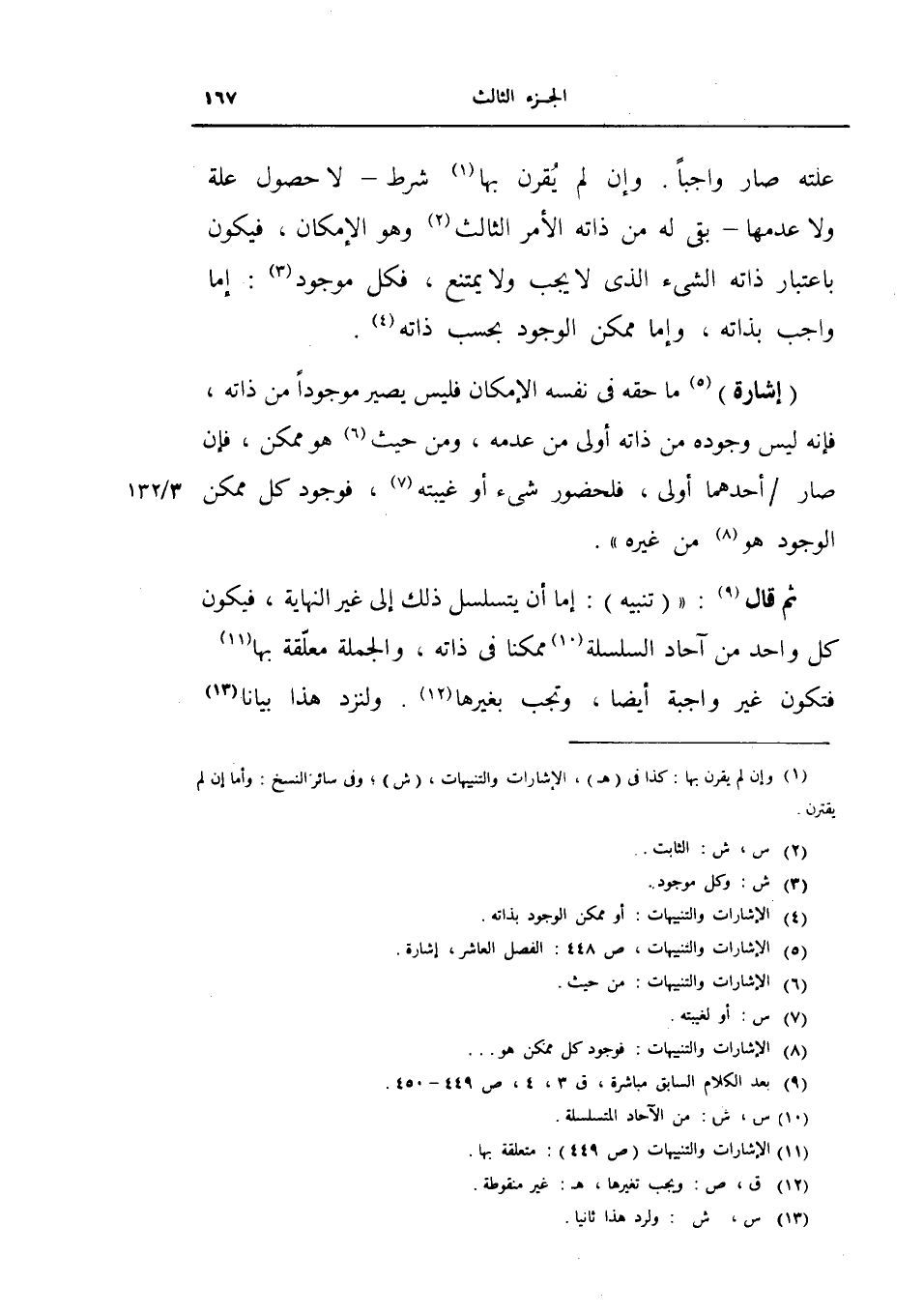 ثم قال تنبيه: إما أن يتسلسل ذلك إلى غير النهاية، فيكون كل واحد من أحاد السلسلة ممكناً في ذاته، والجملة معلقة بها فتكون غير واجبة أيضا، وتجب بغيرها. ولنرد هذا بياناً