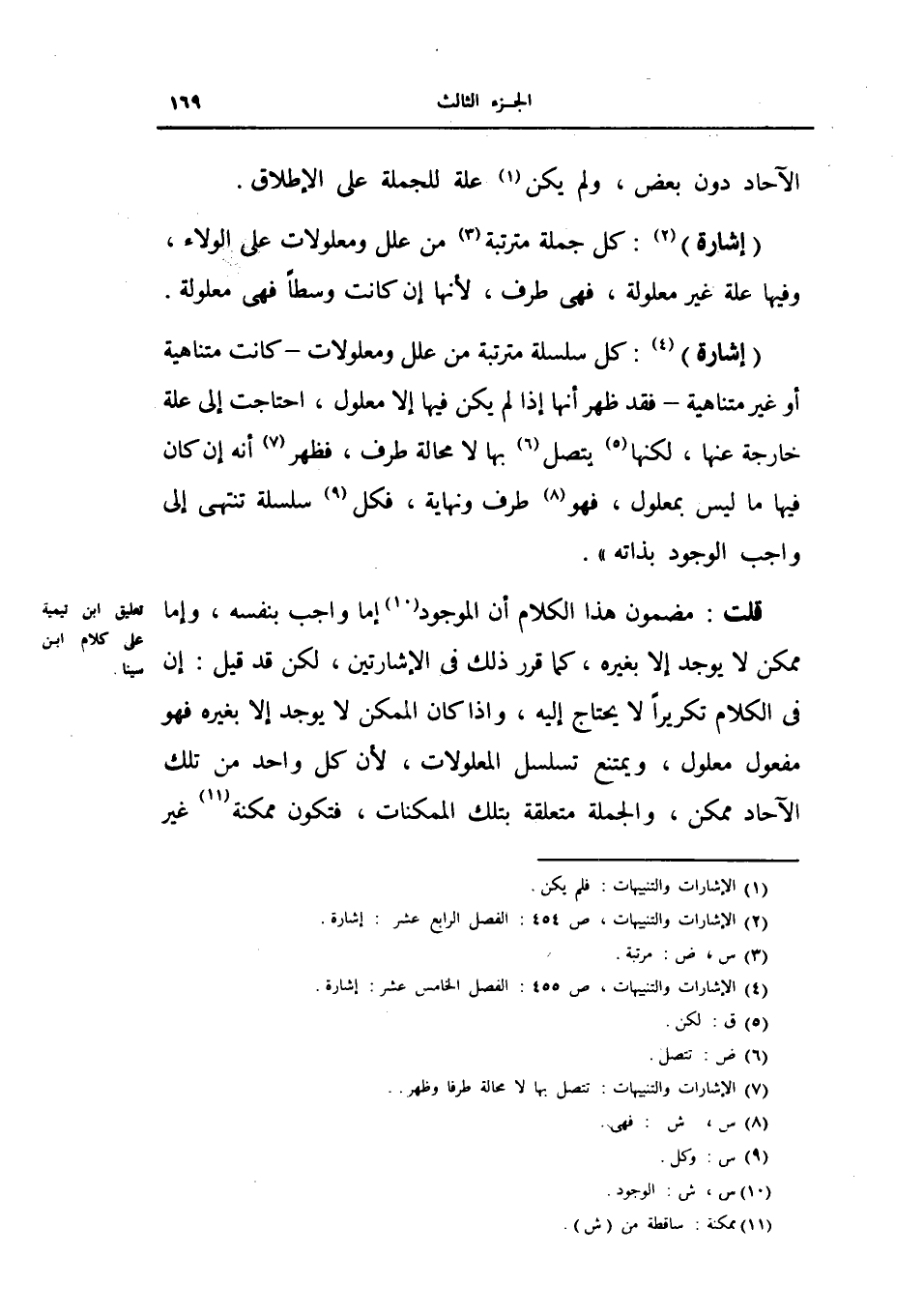 إشارة كل سلسلة مترتبة من علل ومعلولات كانت متناهية أو غير متناهية فقد ظهر أنها لم يكن فيها إلا معلول، احتاجت إلى علة خارجة عنها لكنها يتصل بها لا محالة طرف، فظهر أنه إن كان فيها ما ليس بمعلول، فهو طرف ونهاية، فكل سلسلة تنتهي إلى واجب الوجود بذاته