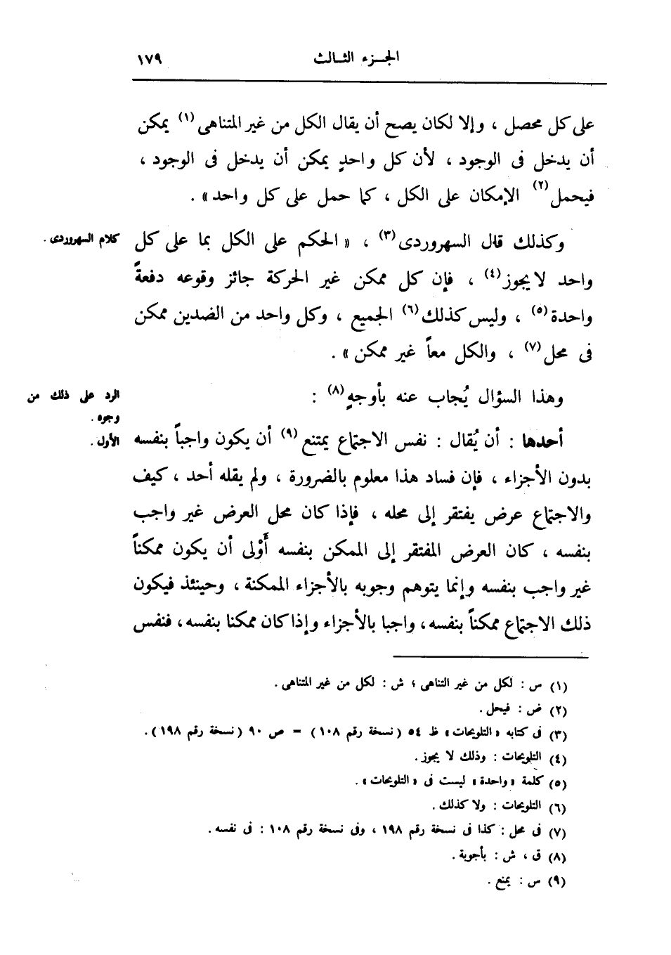 وكذلك قال السهروردي الحكم على الكل بما على كل واحد لا يجوز، فإن كل ممكن غير الحركة جائز وقوعه دفعة واحدة، وليس كذلك الجميع، وكل واحد من الضدين ممكن في محل، والكل معاً غير ممكن