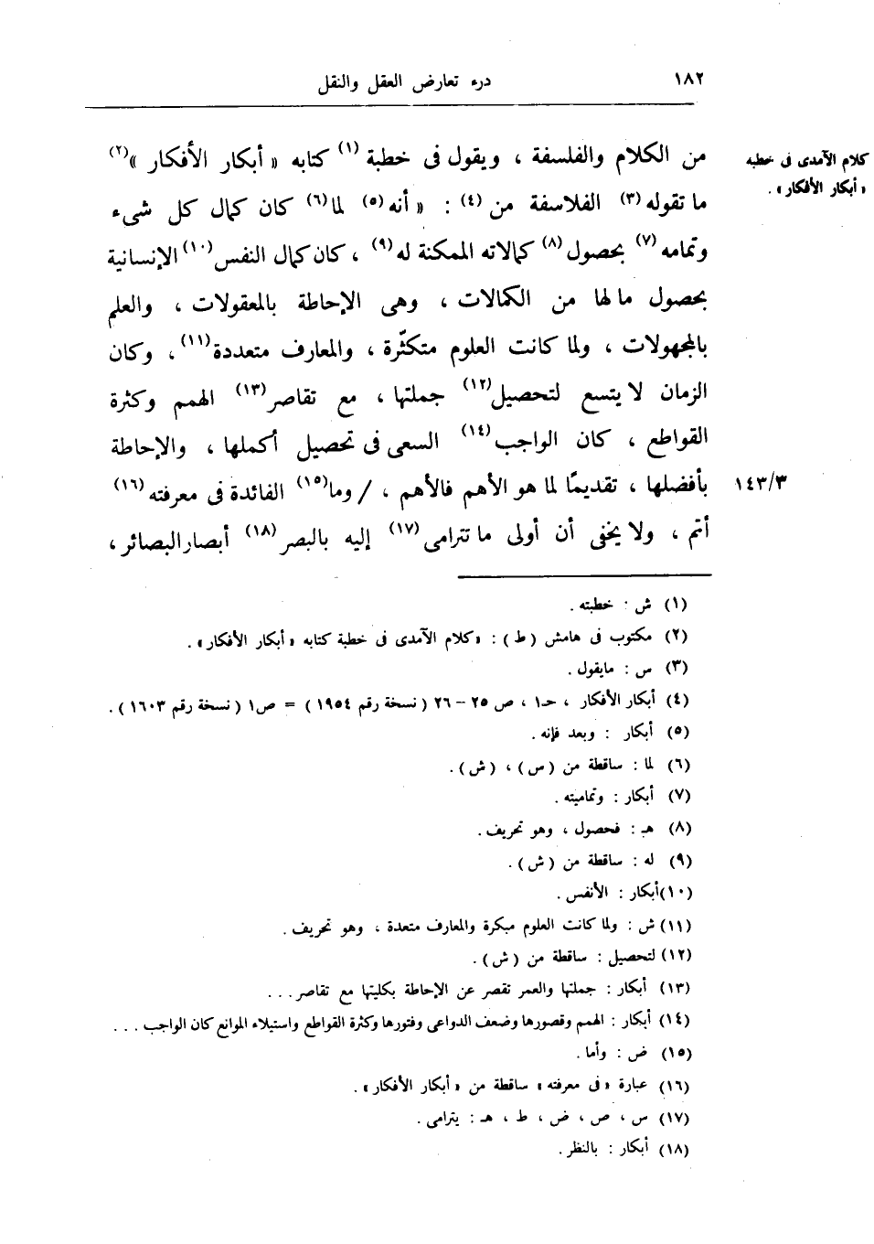 من الكلام والفلسفة ويقول في خطبة كتابه أبكار الأفكار ما تقوله الفلاسفة من أنه لما كان كمال كل شيء وتمامه بحصول كمالاته الممكنة له، كان كمال النفس الإنسانية بحصول ما لها من الكمالات، وهي الإحاطة بالمعقولات، والعلم بالمجهولات، ولما كانت العلوم متكثرة، والمعارف متعددة، وكان الزمان لا يتسع لتحصيل جملتها، مع تقاصر الهمم وكثرة القواطع، كان الواجب السعي في تحصيل أكملها، والإحاطة بأفضلها، تقديماً لما هو الأهم فالأهم، وما الفائدة في معرفته أتم، ولا يخفى أن أولى ما تترامى إليه بالبصر أبصار البصائر