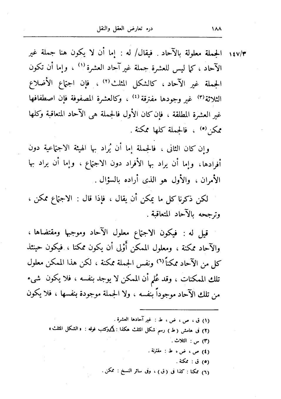 فيقال له: إما أن لا يكون هنا جملة غيرالآحاد، كما ليس للعشرة جملة غير آحاد العشرة، وإما أن تكون الجملة غير الآحاد، كالشكل المثلث، فإن اجتماع الإضلاع الثلاثة غير وجودها مفترقة، وكالعشرة المصفوفة فإن اصطفافها غير العشرة المطلقة فإن كان الأول فالجملة هي الآحاد المتعاقبة وكلها ممكن فالجملة كلها ممكنة.