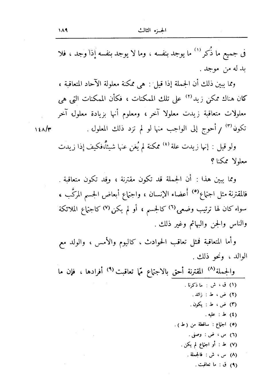 ومما يبين هذا أن الجملة قد تكون مقترنة وقد تكون متعاقبة فالمقترنة مثل اجتماع أعضاء الإنسان واجتماع أبعاض الجسم المركب سواء كان لها ترتيب وضعي كالجسم أو لم يكن كاجتماع الملائكة والناس والجن والبهائم وغير ذلك.