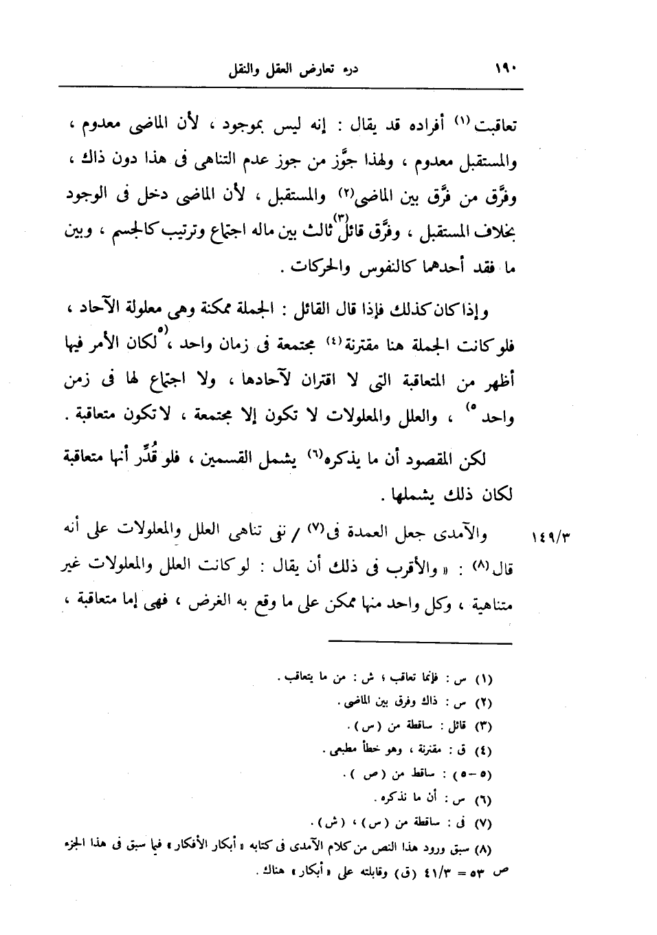 وإذا كان كذلك فإذا قال اقائل: الجملة ممكنة وهي معلولة الآحاد، فلو كانت الجملة هنا مقترنة مجتمعة في زمان احد، لكان الأمر فيها أظهر من المتعاقبة التي لا اقتران لآحادها، ولا أجتماع لها في زمن واحد، والعل والمعلولات لا تكون إلا مجتمعة، لا تكون متعاقبة.