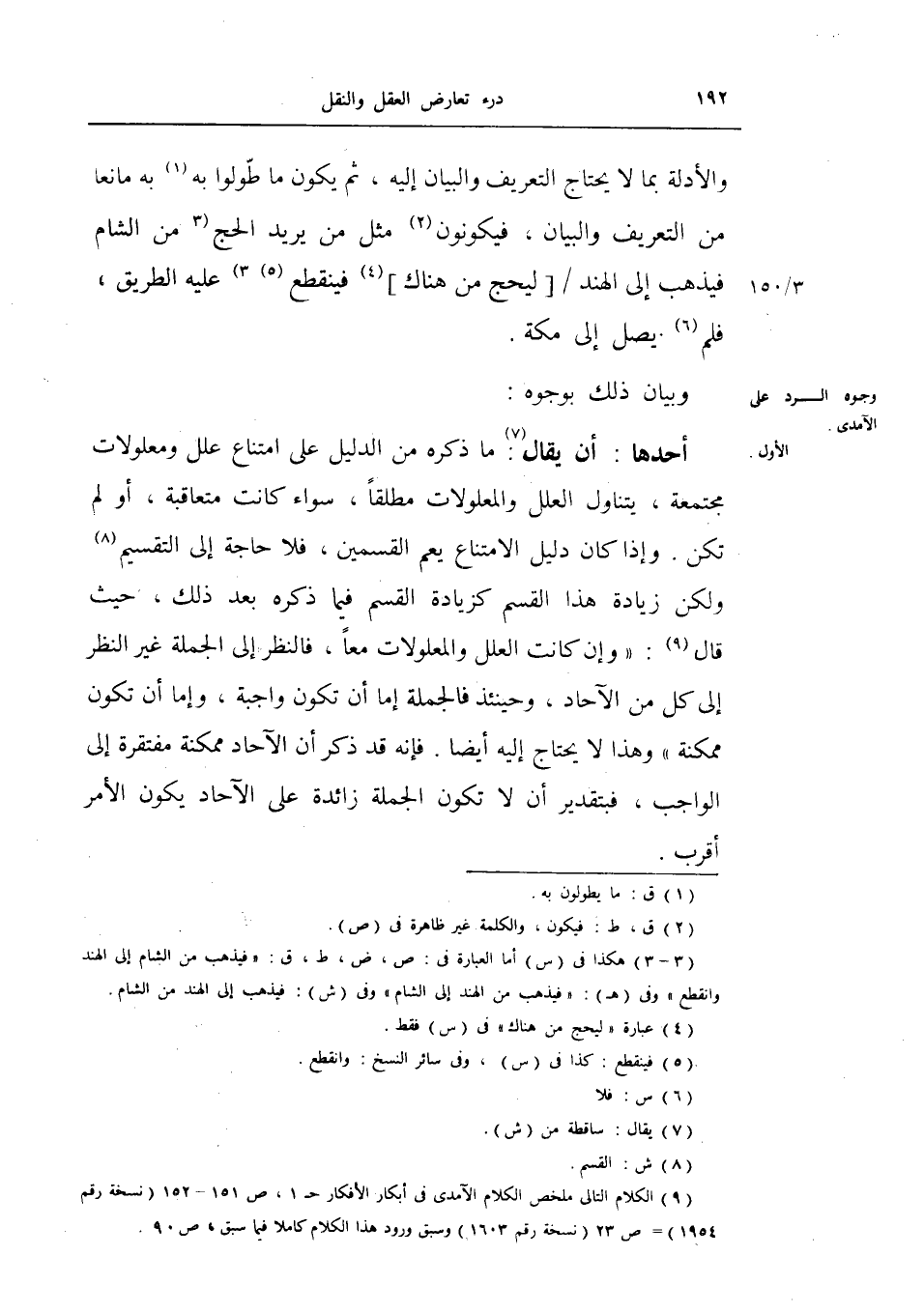 وإذا كان دليل الامتناع يعم القسمين، فلا حاجة إلى التقسيم ولكن زيادة هذا القسم كزيادة القسم فيما ذكره بعد ذلك، حيث قال وإن كانت العلل والمعلولات معاً، فالنظر إلى الجملة غير النظر إلى كل من الآحاد وحينئذ فالجملة إما أن تكون واجبة، وأما أن تكون ممكنة وهذا لا يحتاج إليه أيضاً.