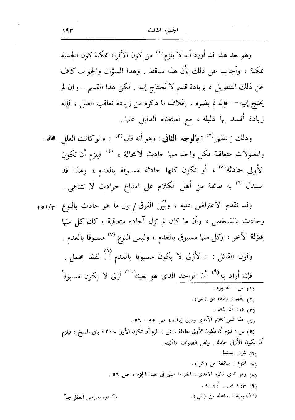 وذلك يظهر بالوجه الثاني: وهو انه قال لو كانت العلل والمعلولات متعاقبة فكل واحد منها حادث لا محالة فيلزم أن تكون الأولى حادثة، او تكون كلها حادثة مسبوقة بالعدم، وهذا قد استدل به طائفة من أهل الكلام على امتناع حوادث لا تتناهى.